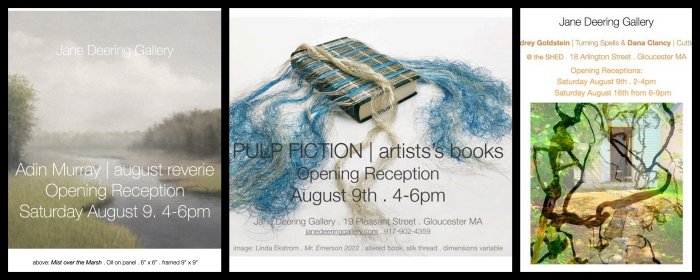 Solo show featuring new works by Adin Murray and group show, Pulp Fiction, featuring artists’ books by Gail Barker, Linda Ekstrom, Leslie Lyman, Jeffrey Marshall, Rhoda Rosenberg, Louise Strawbridge, Willie Alexander, and Geoffrey Bayliss opening this weekend at Jane Deering Gallery location in downtown Gloucester. Jane Deering Gallery is hosting Turning Spells and Cuttings at the satellite The Shed in Annisquam, by Dana Clancy and Audrey Goldstein