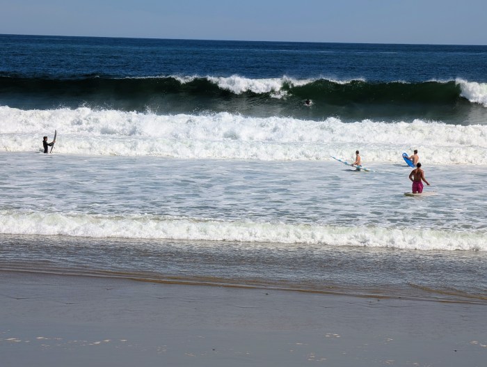Both Long Beach and Good Harbor Beach were closed to swimming again due to shark sightings –and seals, too, viewed from Good Harbor. Rumors about a beached Great White circulated and dissipated. Long Beach reopened to swimmers. The waves are tremendous.
