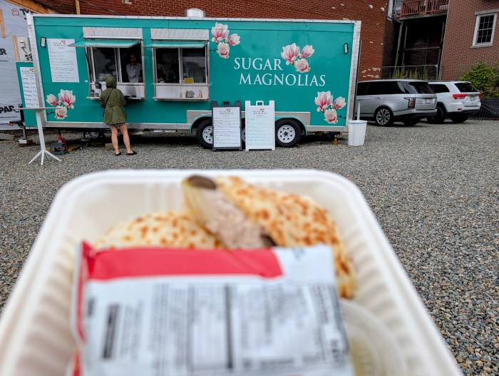 Sugar Magnolia’s toasties are scrumptious specialty sandwich options grilled “toasty” in a flour wrap ready to grab hold and go (with pickles and chips). This one is chicken salad with sliced apple and red grapes. The french toast of the day was cozy fall spice pumpkin with infused fluffy whip cream. Both are ample enough to share. Can’t choose? Bring a friend and split a sweet and salty order for two!