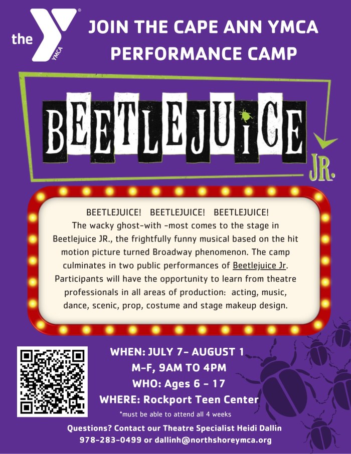 The Cape Ann YMCA presents Beetlejuice Jr. on July 31 and August 1 at 5:00 PM on Evans Field in Rockport , MA . Tickets are $16 for Adults and $12 for Children 12 and under. Tickets can be purchased with cash at the door day of the performance. For more information: Contact YMCA Creative Arts Coordinator Heidi Dallin at dallinh@northshoreymca.org or 978-283-0499.