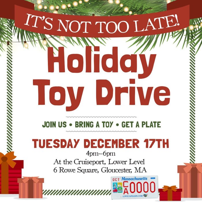 Give the perfect gift this Holiday Season. The Cape Ann Community Foundation will host a special event to help you order a Cape Ann License Plate while giving you an extra opportunity to donate a toy, gift card or cash in support of Senator Bruce Tarr’s Annual Toy Drive. On Tuesday, December 17th from 4-6 PM at Cruiseport’s Lower Level. The Cape Ann Community Foundation Board Members will be on hand to help you order a Cape Ann License Plate. Bring your vehicle registration, drivers license and credit card.