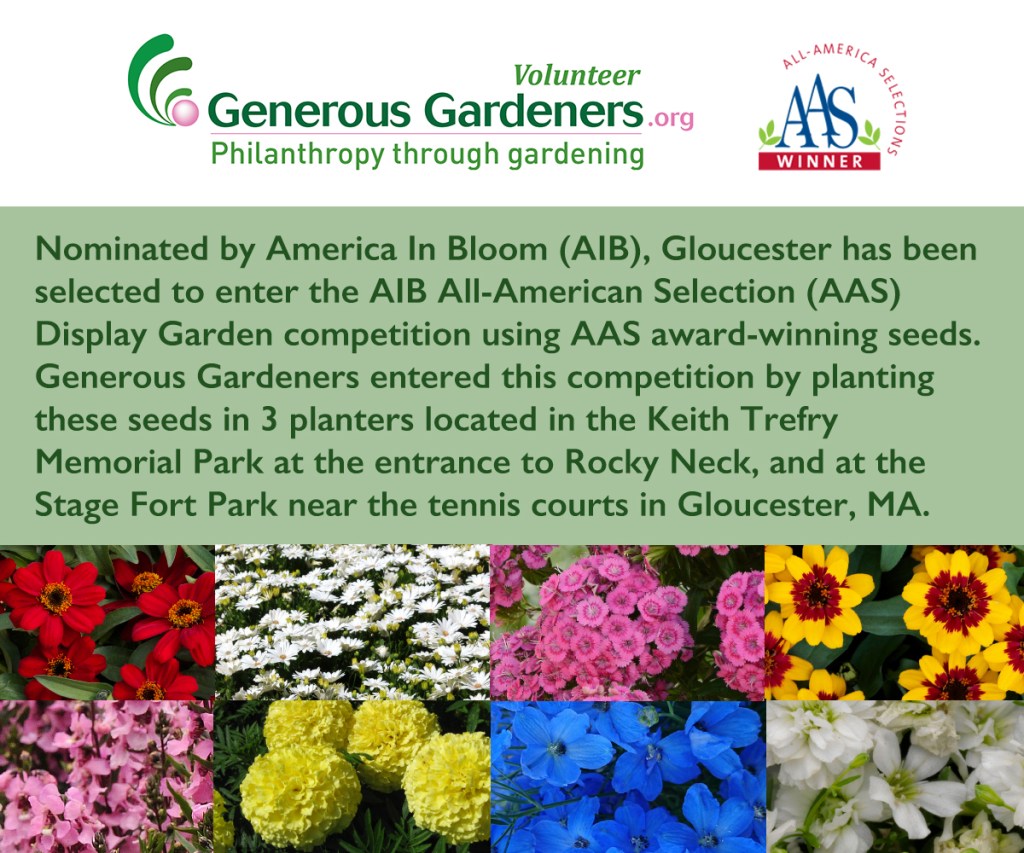 Gloucester won the All-American Selections award through the America in Bloom program! Generous Gardeners grew special varieties of flowers from seed and displayed them in planters on Rocky Neck and Stacy Boulevard. Gloucester was one of 20 communities selected to participate.