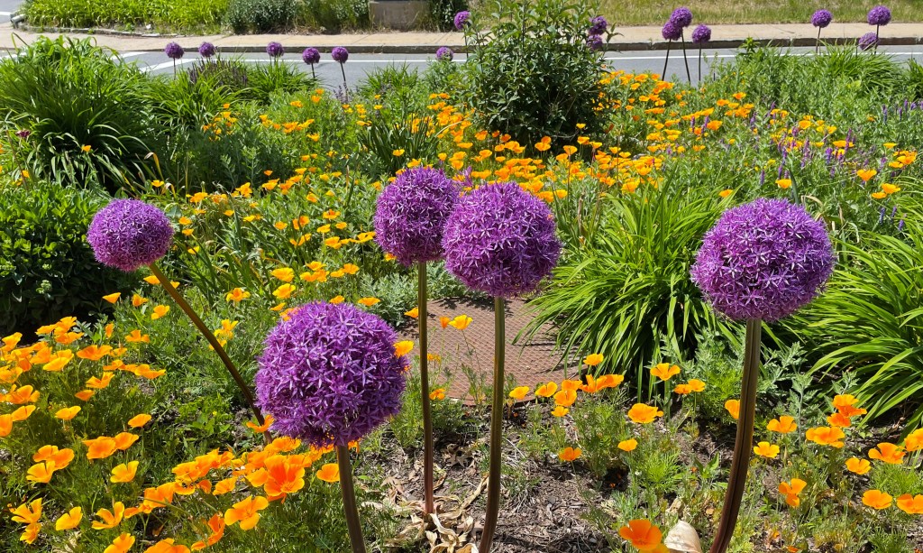 Generous Gardeners have made our traffic islands look nice. Check out the poppies and alliums at the end of 128!