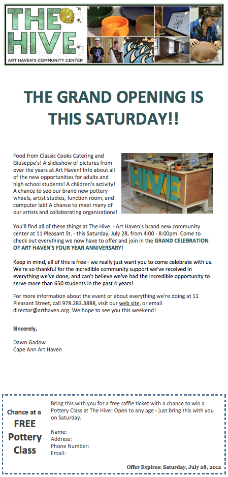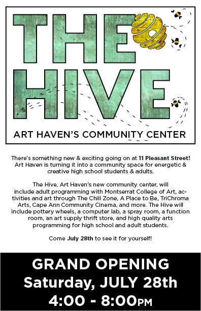What better way is there to celebrate Art Haven’s four year anniversary than the GRAND OPENING of THE HIVE, their new adult and high school community center on Pleasant Street!?! So… Save the date – July 28th! Free event with food from Classic Cooks, dessert from Giuseppe’s and drinks from Pleasant Street Tea Company… It’s gonna be A LOT of fun. Come celebrate with us!