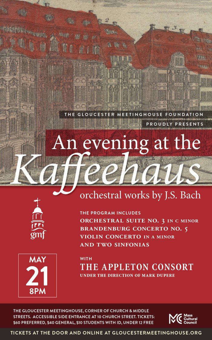 The next program in the spring series at the Meetinghouse is performance of beloved Bach orchestral works including the Brandenburg Concerto No. 5, played on period instruments by the Appleton Consort on Saturday, May 21, at 8:00pm. For more information and online ticket purchases visit www.gloucestermeetinghouse.org