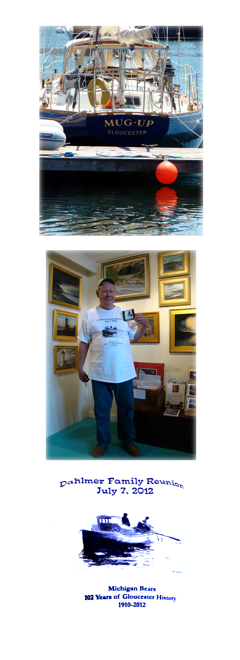 I thought this was the perfect image to use to invite people for Mug Up – Sunday 9:30 am at Khan Studio & the GMG Gallery, 77 Rocky Neck Ave. Whoever owns this boat tied up in Smiths Cove, you’re invited to Mug Up too. Bill Hubbard of Gloucester is here visiting from Melbourne, FL for the 102nd Dahlmer Family Reunion. Bill’s mother was a Dahlmer, the 3rd of 13 kids, and sister to LA Dahlmer’s father. Bill will be at Mug Up, so come by and say hi.