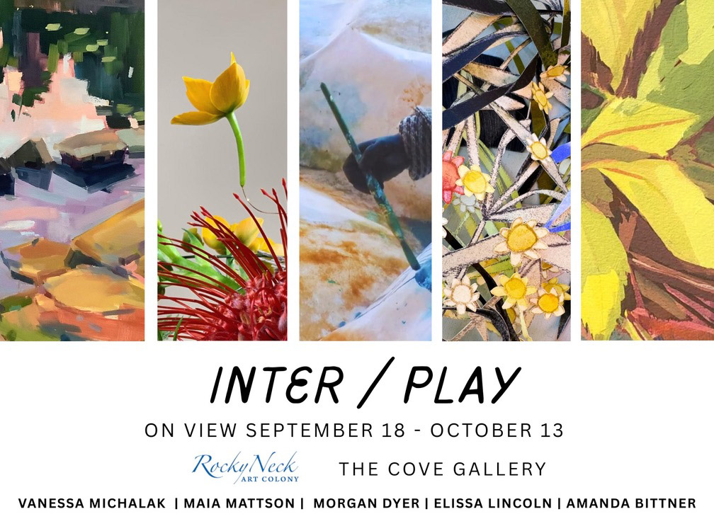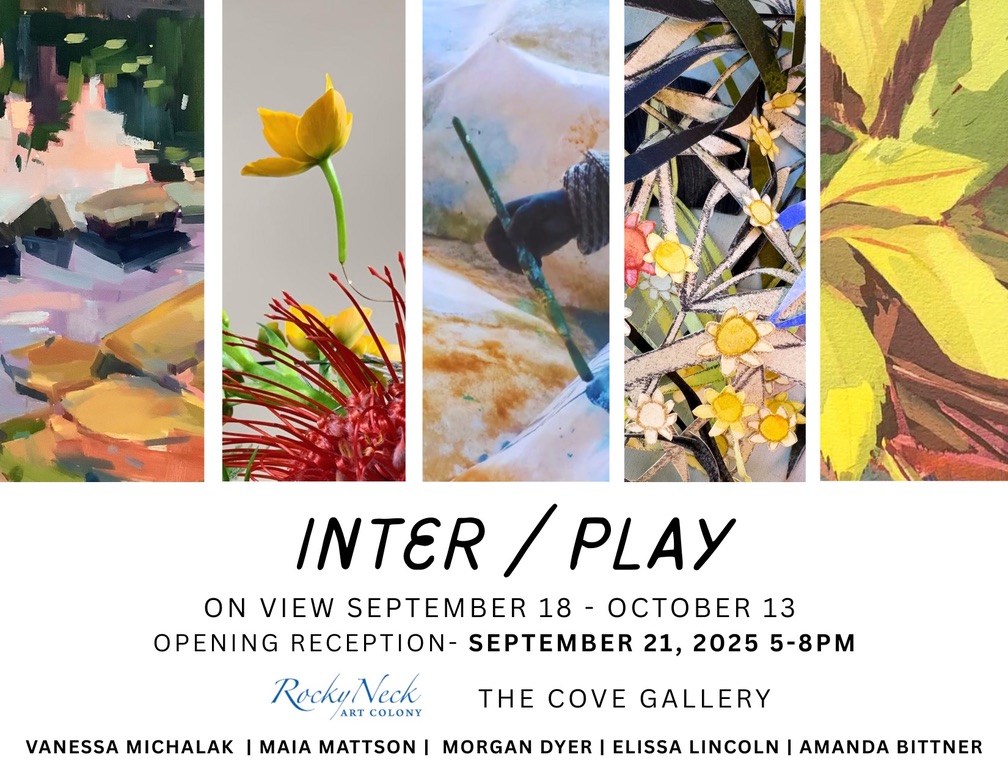 Rocky Neck Art Colony is pleased to present INTER / PLAY, a group exhibition bringing together five Cape Ann-based artists—Morgan Dyer, Amanda Bittner, Vanessa Michalak, Elissa Lincoln, and Maia Mattson—to explore the dynamic relationships between solitude, nature, and the creative process. The exhibition unfolds across two interconnected gallery spaces, each offering a distinct entry point into the artists’ practices. The first space features a curated selection of framed works, introducing viewers to each artist’s dialogue with the natural world. Here, themes of structure, rhythm, and personal connection emerge.