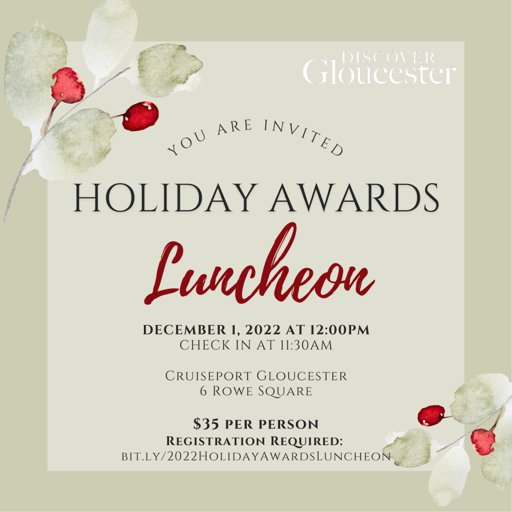 Join Discover Gloucester for the 2022 Holiday Awards Luncheon on December 1st at 12:00pm at Cruiseport Gloucester. This event is back for the first time since 2019. The gathering is a time for colleagues and community members to celebrate the holiday season, and for Discover Gloucester to recognize individuals and organizations who have made a lasting impact in the tourism business community this year.