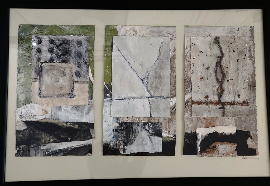 Tobi Klein explores mono-printing, collage, and other mixed-media techniques, taking inspiration from the continual shifting of light, color, and pattern of the granite quarries and the sea. She builds a story, inviting viewers to peel back the layers and look below the surface.