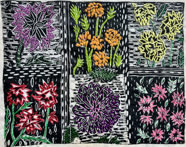 Patricia Wellenkamp uses a series of carved linoleum blocks to print on cotton and other fabrics. She incorporates embroidery, paper, and other elements to add ornamentation and complexity to images that might come from an ancestor’s dress, dahlias in her garden or imagined landscapes.