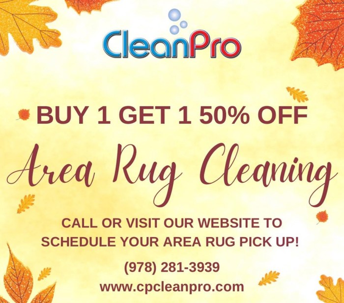 October is here and it’s the perfect time to take advantage of this fall promo with CleanPro. Give your area rugs a thorough cleaning with this “buy one, get on 50% off” promo. You can call (978) 281-3939 or visit http://www.cpcleanpro.com and schedule your area rug pick up! Have CleanPro deliver your rugs back to you in perfect fall condition to start the new season off right.