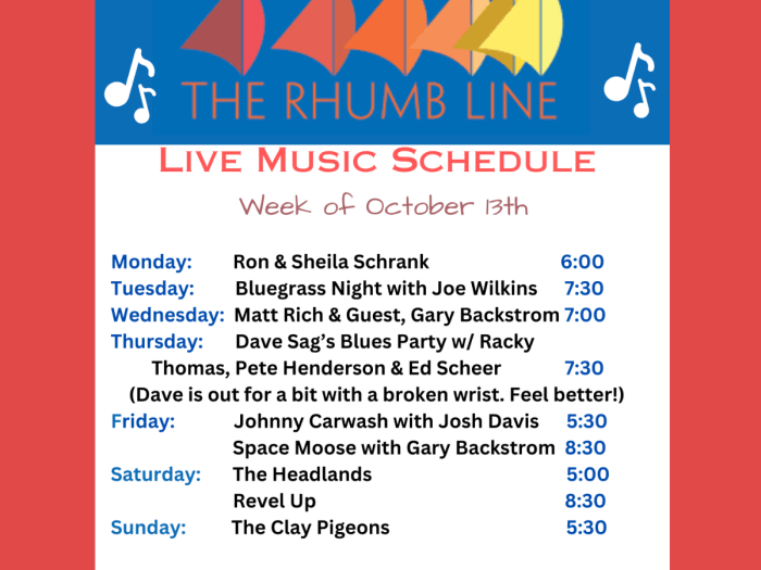 This week’s live music schedule at The Rhumb Line. As always, live music 7 days per week.