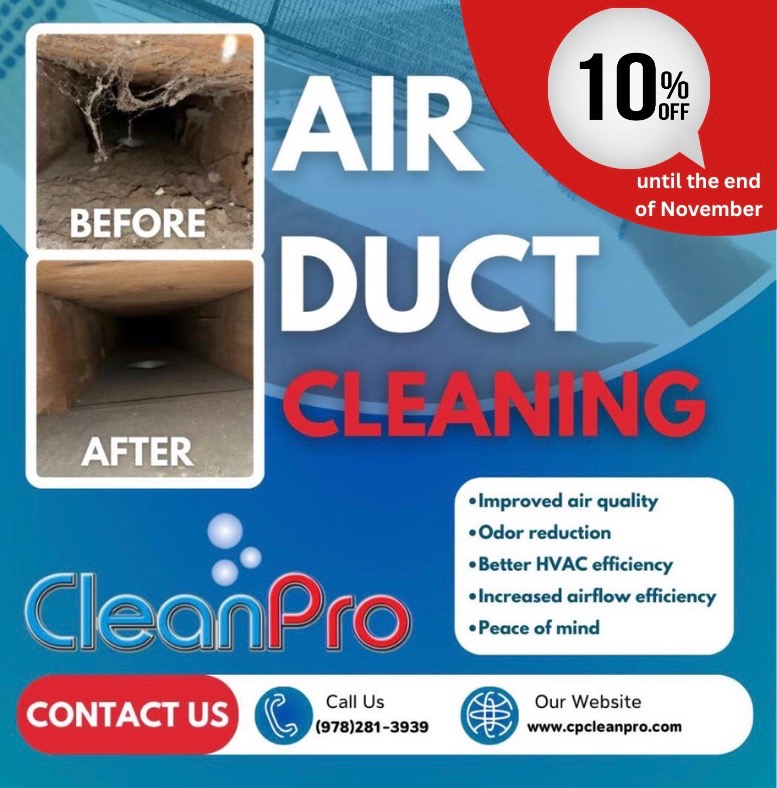 Call CleanPro to take advantage of this 10% air duct cleaning. It’s not only time to set the clocks back, it’s time to clean those air ducts. So many benefits including improved air quality, odor reduction, better HVAC efficiency, increased airflow efficiency, and Peace of Mind! https://www.cpcleanpro.com/