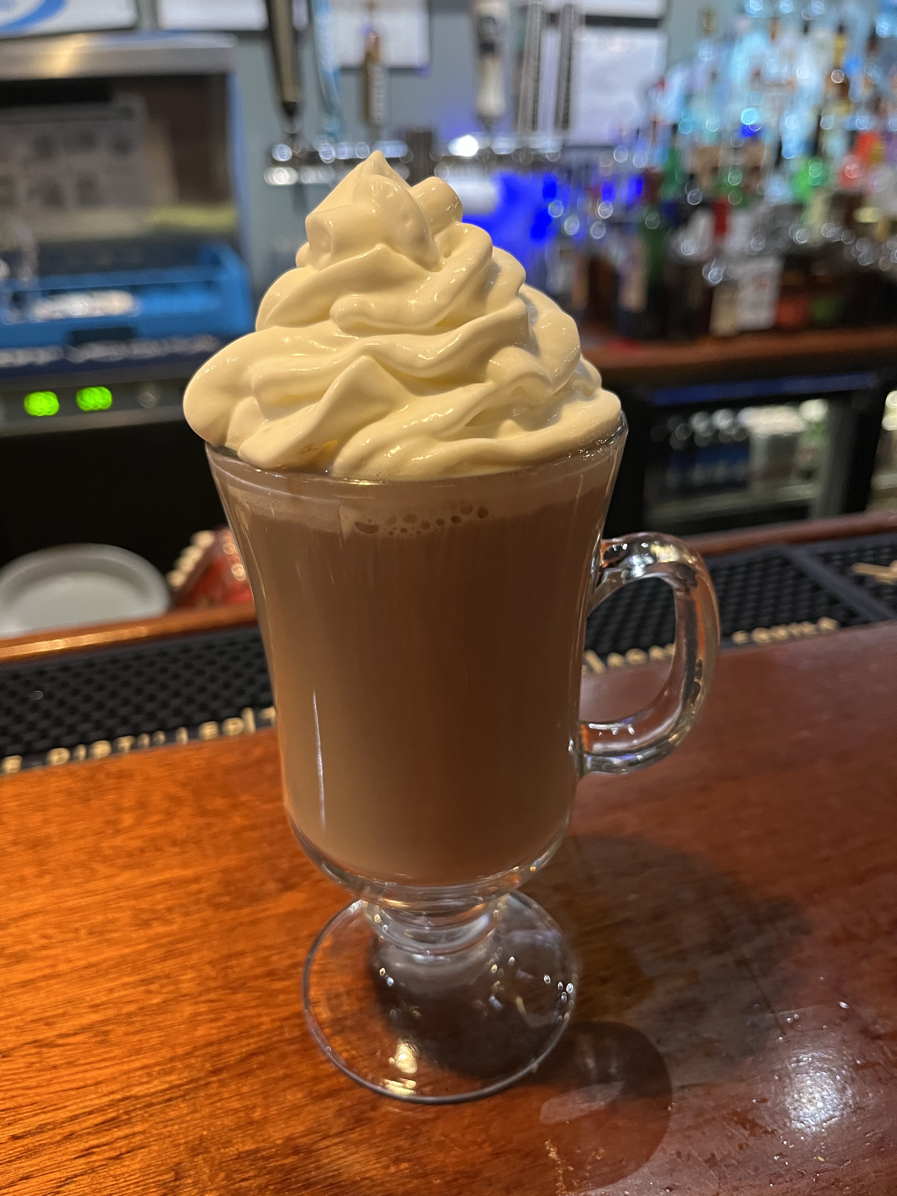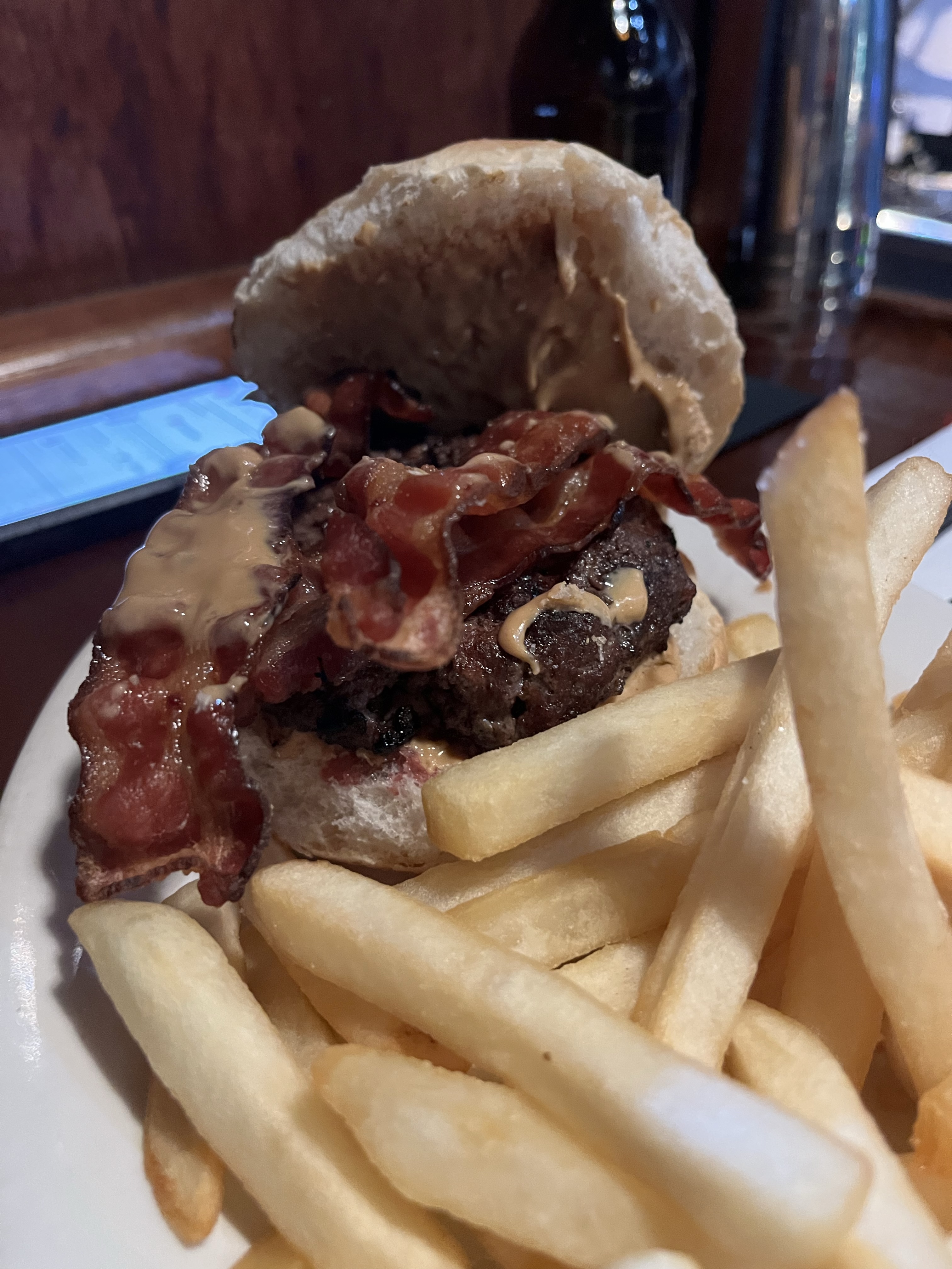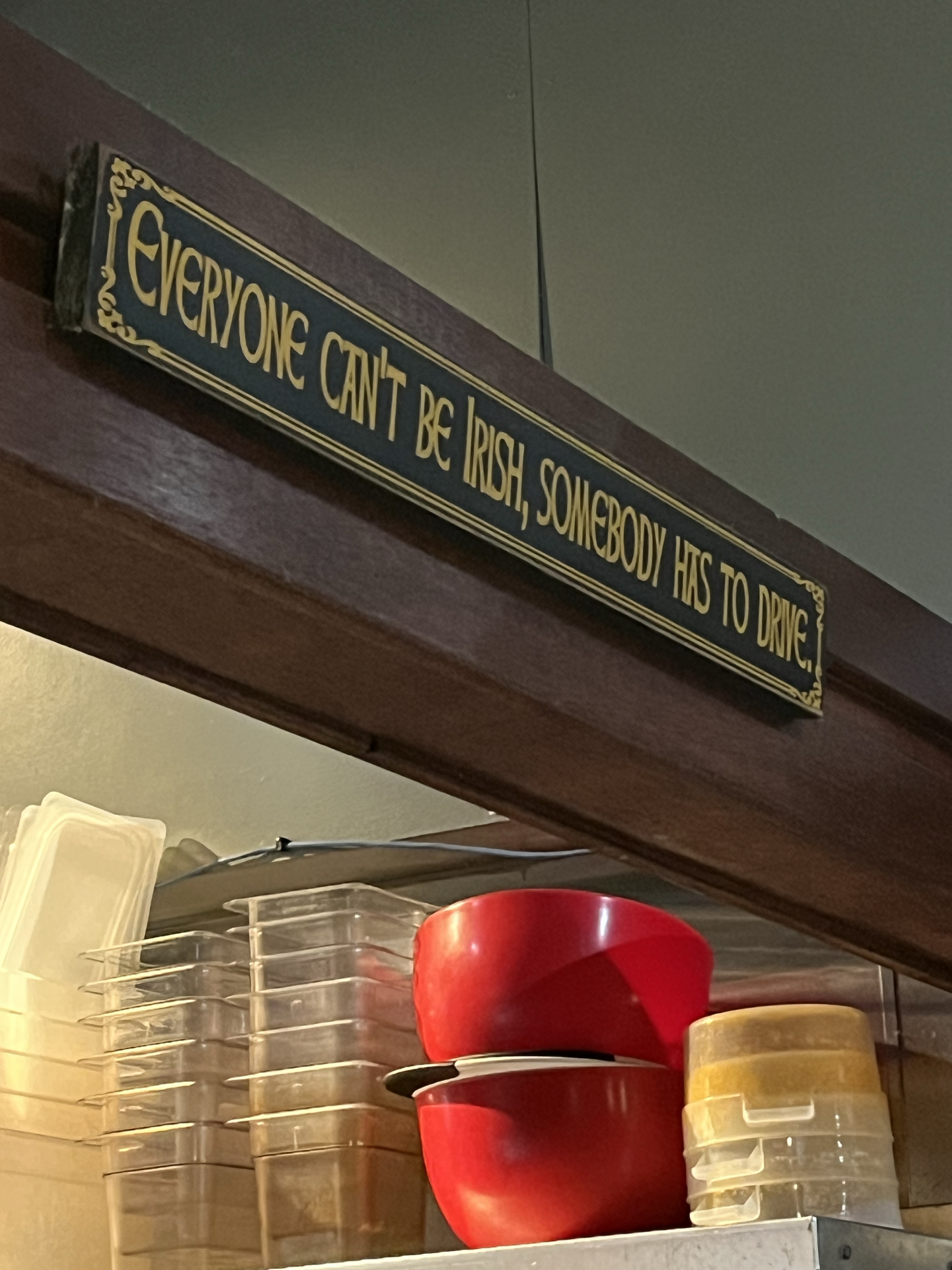 I had the wing special which was Carolina BBQ wings….OUTSTANDING. Just the right amount of tang and zip. I’ll order those again in a second. Jim had been wanting one of their infamous peanut butter bacon burgers and he was very full when we left. I topped the meal off with an Irish coffee, a logical choice for this Irish pub. Great service, yummy food AND football on the TVS….(two out of three isn’t bad…..)