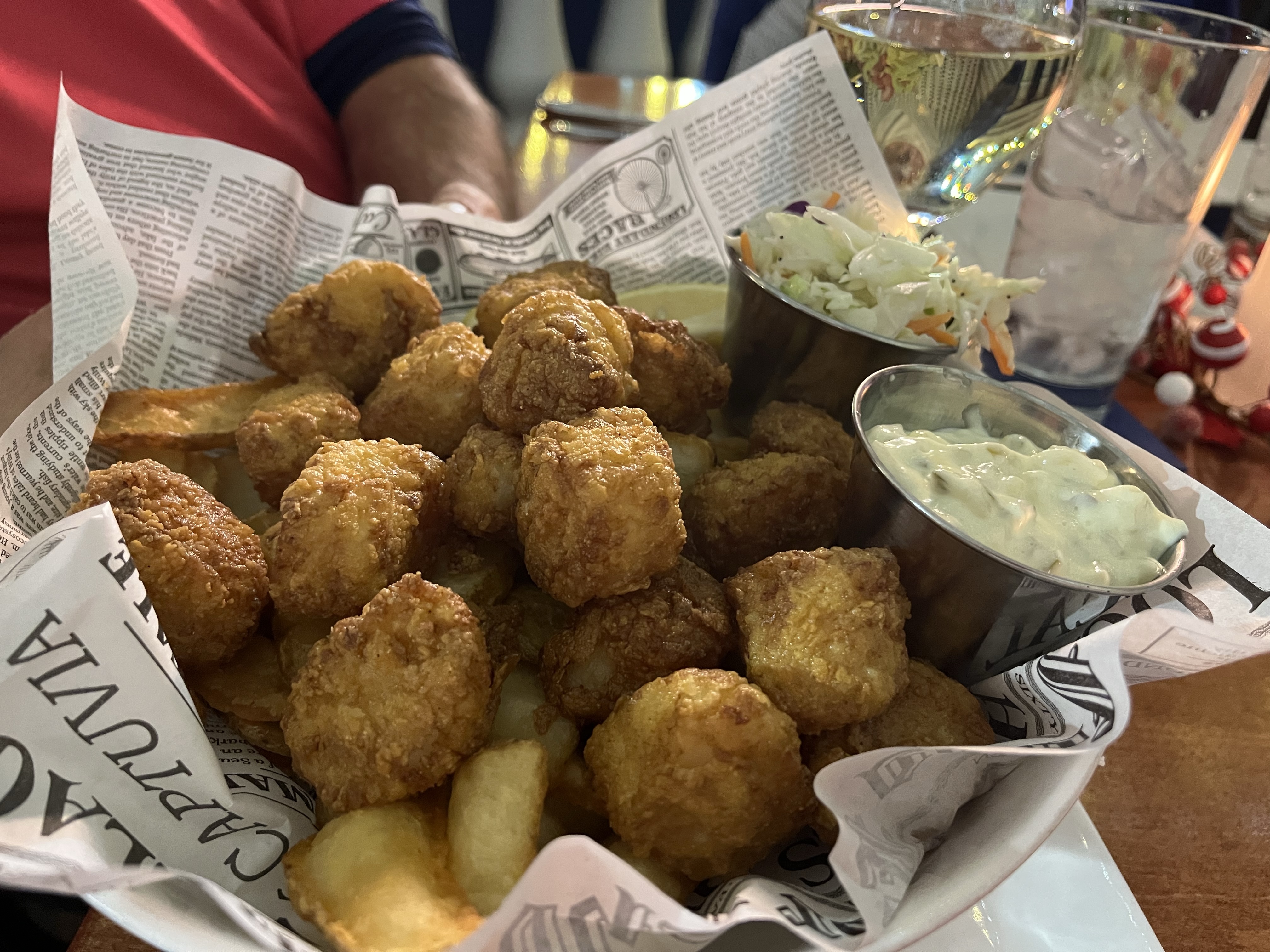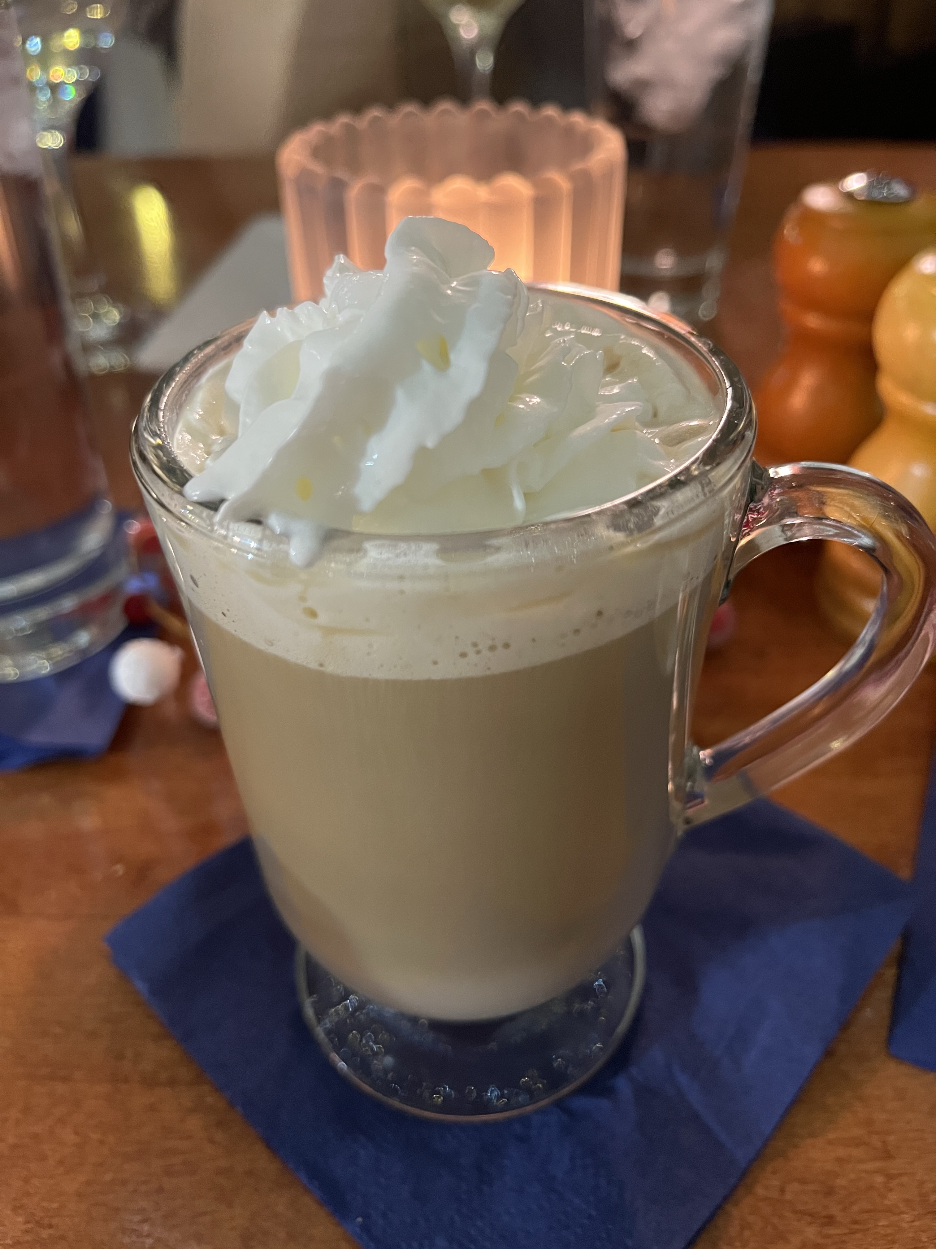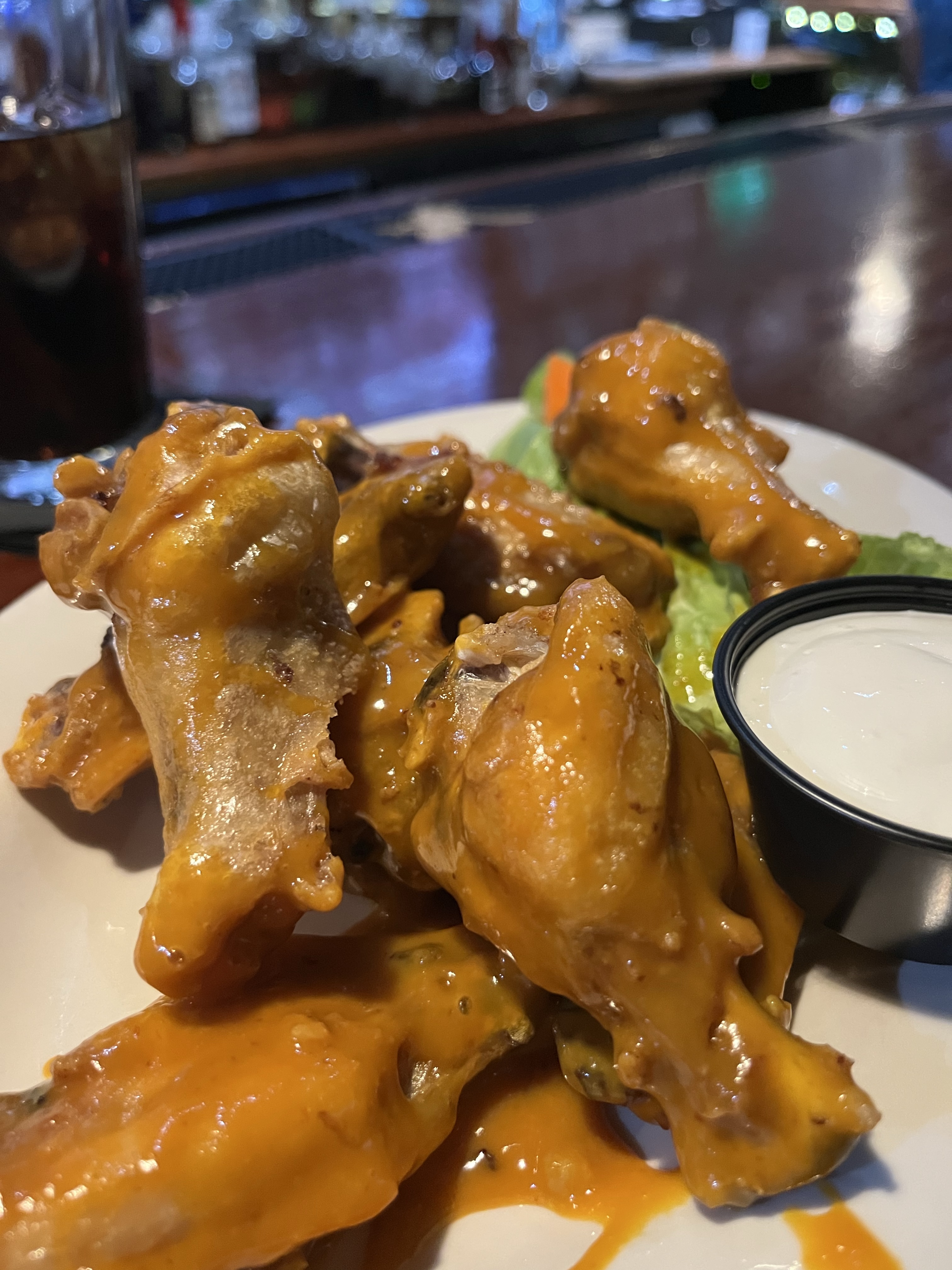 I had the wing special which was Carolina BBQ wings….OUTSTANDING. Just the right amount of tang and zip. I’ll order those again in a second. Jim had been wanting one of their infamous peanut butter bacon burgers and he was very full when we left. I topped the meal off with an Irish coffee, a logical choice for this Irish pub. Great service, yummy food AND football on the TVS….(two out of three isn’t bad…..)