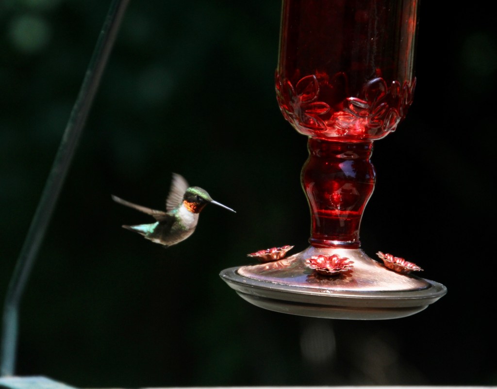This guy is guilty of nectar thieving in the first degree! He even looks guilty. We have been bothered by this raccoon stealing hummingbird nectar on a regular basis. Our neighbor Jim caught him and I’m told he’s been transferred to a new home. No, not in Joey’s neighborhood. Joey needs no further excuses for his hummingbird failures.