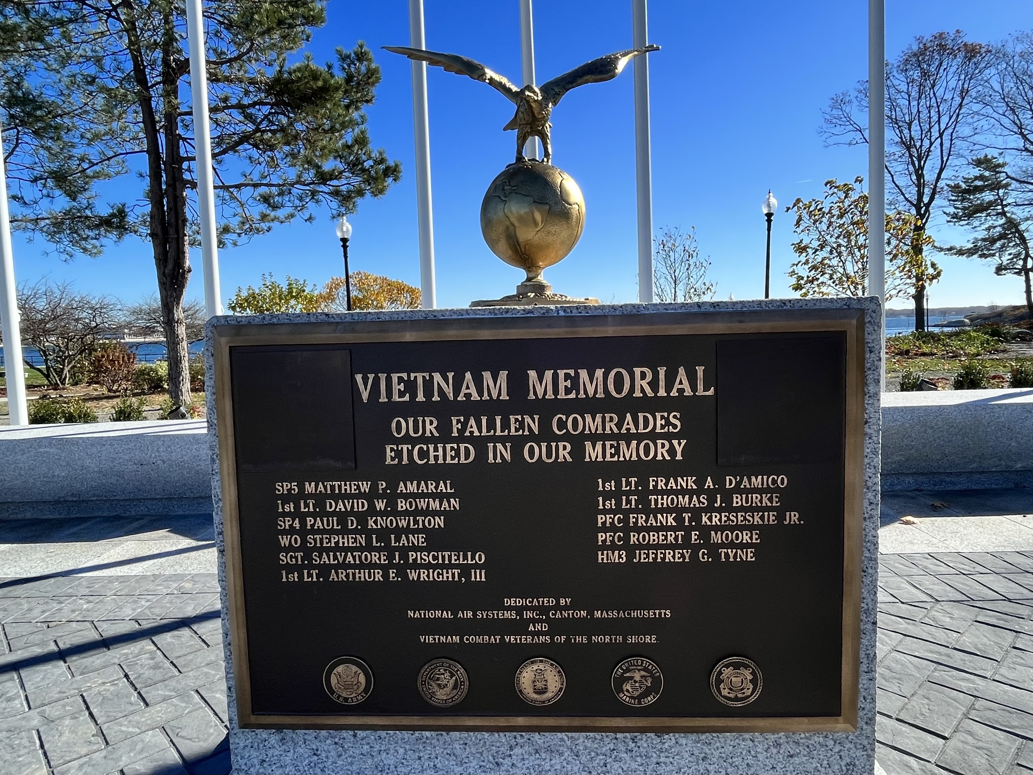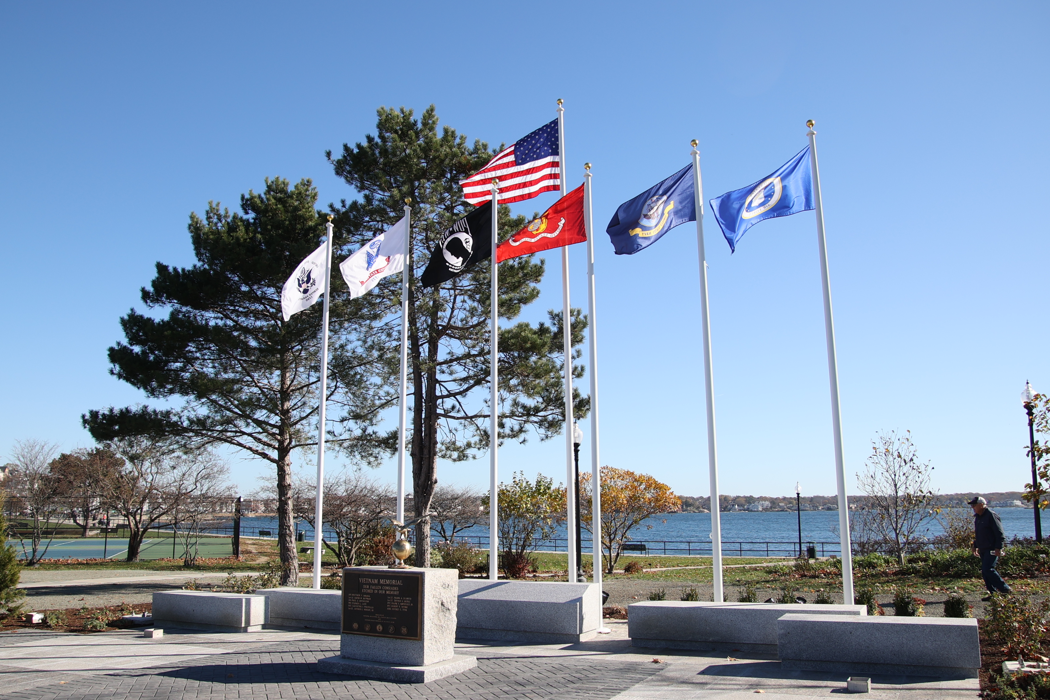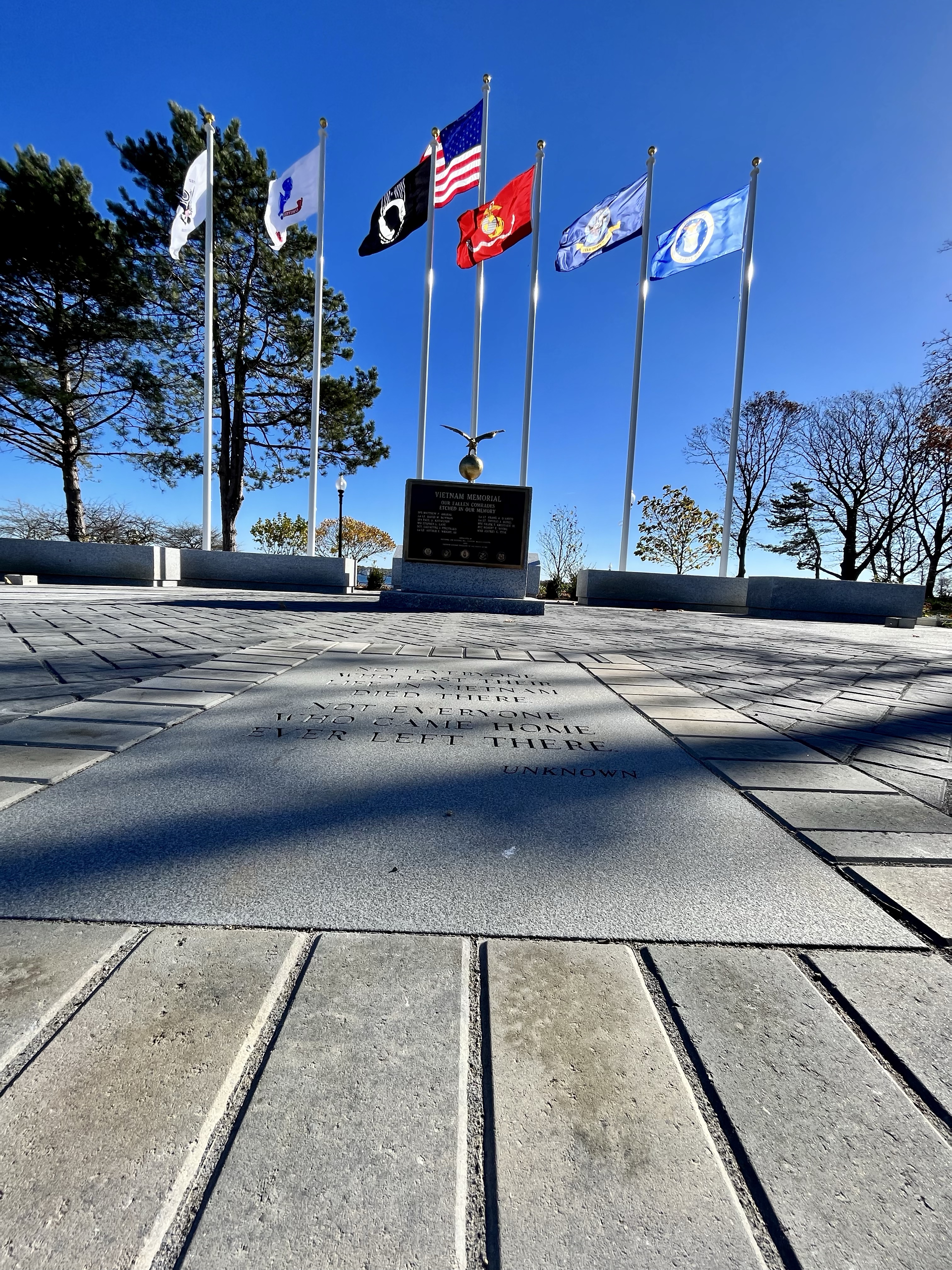 The recently relocated and redesigned Vietnam Memorial now has military flags flying to honor our local Vietnam veterans and those who lost their lives in the conflict. A ceremony is scheduled for 11:30 today at the new Stage Fort Park location near the tennis courts. The Veterans’ Day ceremony at the high school is scheduled for 9 AM and this event will follow at 11:30 am. It’s absolutely beautiful and thoughtfully designed for contemplation and remembrance and I hope you can stop by today or sometime soon to take a look. Stop, Reflect, Honor.