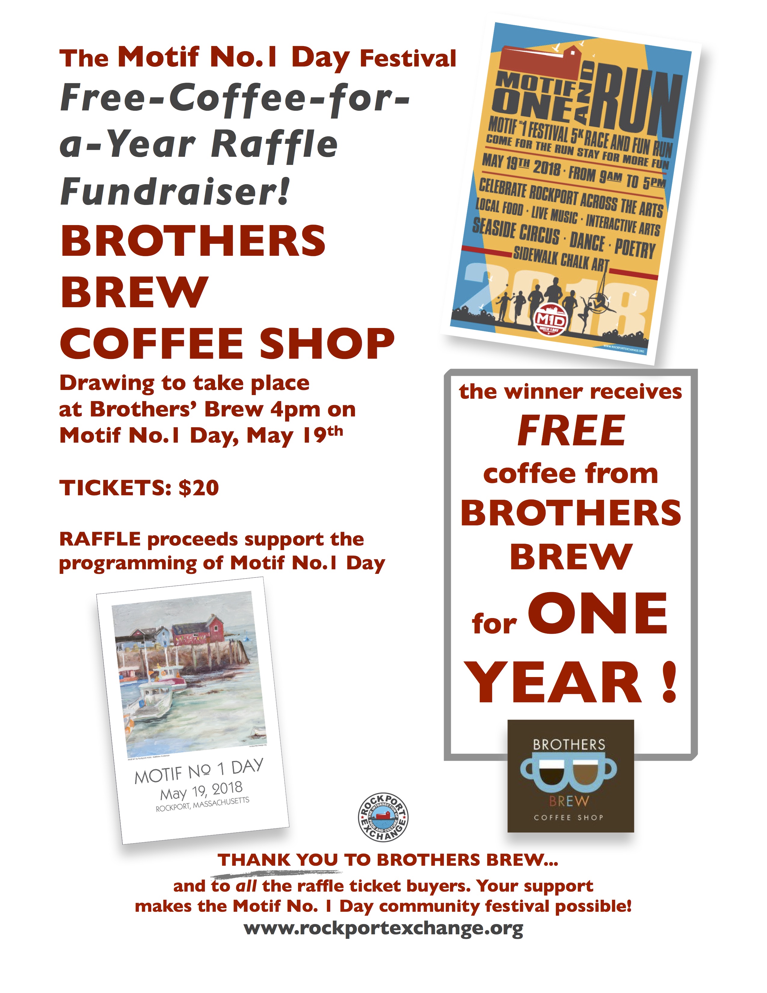One fun way you can help fund Motif No. 1 Day is by entering the “Win Free Coffee for a Year” raffle at Brothers’ Brew. A $20 ticket gives you a chance for a free cup of coffee every day at Rockport’s favorite doughnut (and more) shop. And the staff at BB throws in specialty coffee as part of the deal for the winner, which makes this prize practically priceless. Last year Rockport’s Harbormaster, Rosemary Lesch, won. And since Rosemary holds court in the corner table nearly every day at Brothers’ Brew, she got her money’s worth with that winning raffle ticket over this past year. Think she can win again? Rosemary is hopeful and has already bought her raffle ticket. You have a few days left to stop by Brothers’ Brew and buy your ticket! Thanks for your support and we’ll see you at the Fest! For more details, go to www.rockportexchange.org