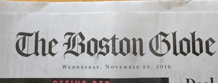 Boston Globe header Nov 21 2019 Spread The GMG Love By Sharing With These Buttons:Tweet Click to email a link to a friend (Opens in new window) Email Click to print (Opens in new window) Print Click to share on WhatsApp (Opens in new window) WhatsApp Pocket Click to share on Reddit (Opens in new window) Reddit Like Loading... Published by Catherine posted content / cell phone photos mine, unless otherwise credited (thumbnail portrait of Catherine at MFA, Boston © David Cox photo) https://www.cryanaid.com/ View all posts by Catherine