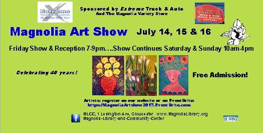 ARTISTS: Registration is now open. Use Event Brite (https://MagnoliaArtShow2017.eventBrite.com) for faster and easier registration. There is a mail in registration form in the Artist Packet should you be unable to register online, starting May 28th. Packets may be picked up at the Librarian’s Desk in the Library or outside the library entrance on Lexington Ave. Click here to download the Artist Packet with registration form and Instructions.