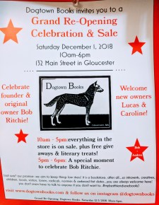 Dogtown Books 132 Main Street Gloucester MA_grand re-opening celebration and sale©c ryan (5) Spread The GMG Love By Sharing With These Buttons:Tweet Click to email a link to a friend (Opens in new window) Email Click to print (Opens in new window) Print Click to share on WhatsApp (Opens in new window) WhatsApp Pocket Click to share on Reddit (Opens in new window) Reddit Like Loading... Published by Catherine posted content / cell phone photos mine, unless otherwise credited (thumbnail portrait of Catherine at MFA, Boston © David Cox photo) https://www.cryanaid.com/ View all posts by Catherine