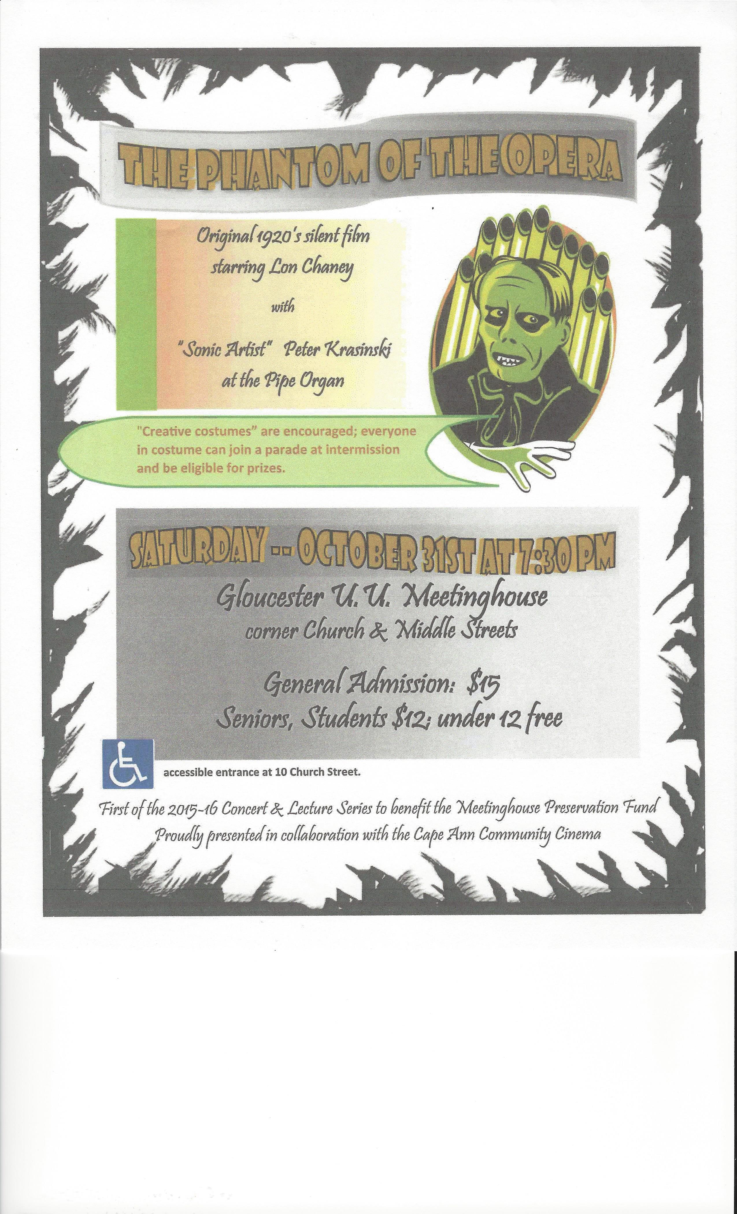 From our FOB Melissa Cox. Please join the UU Church on Halloween night to watch The Phantom of the Opera while listening to Peter Krasinski on the pipe organ! The funds raised will go to benefit the Meetinghouse Preservation Fund. $15 General Admission $12 Seniors, Students, and free for 12 and under