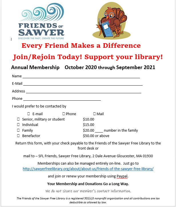 “Please join or renew to help the Friends of Sawyer Free support the programs that take place in the library!”