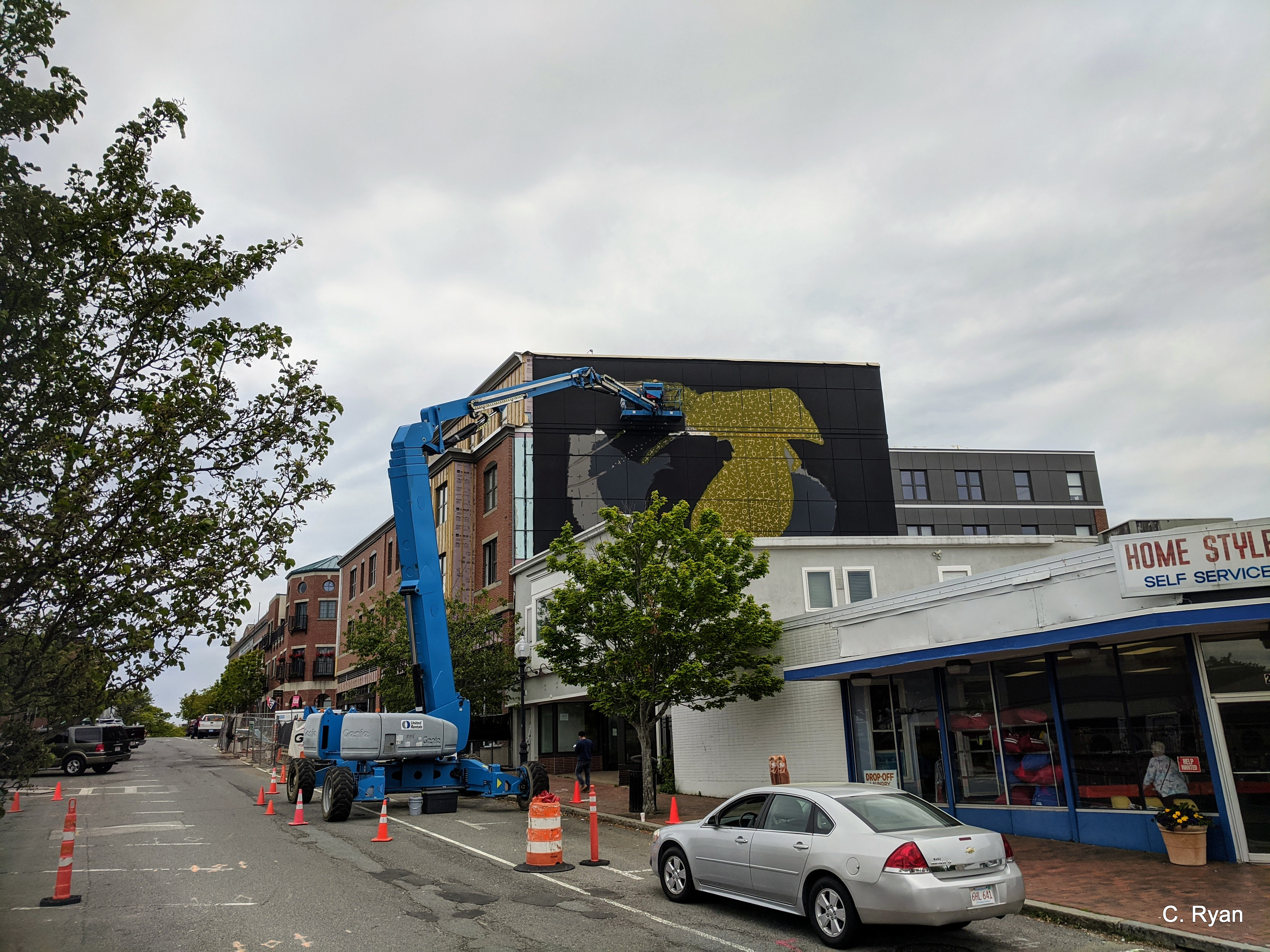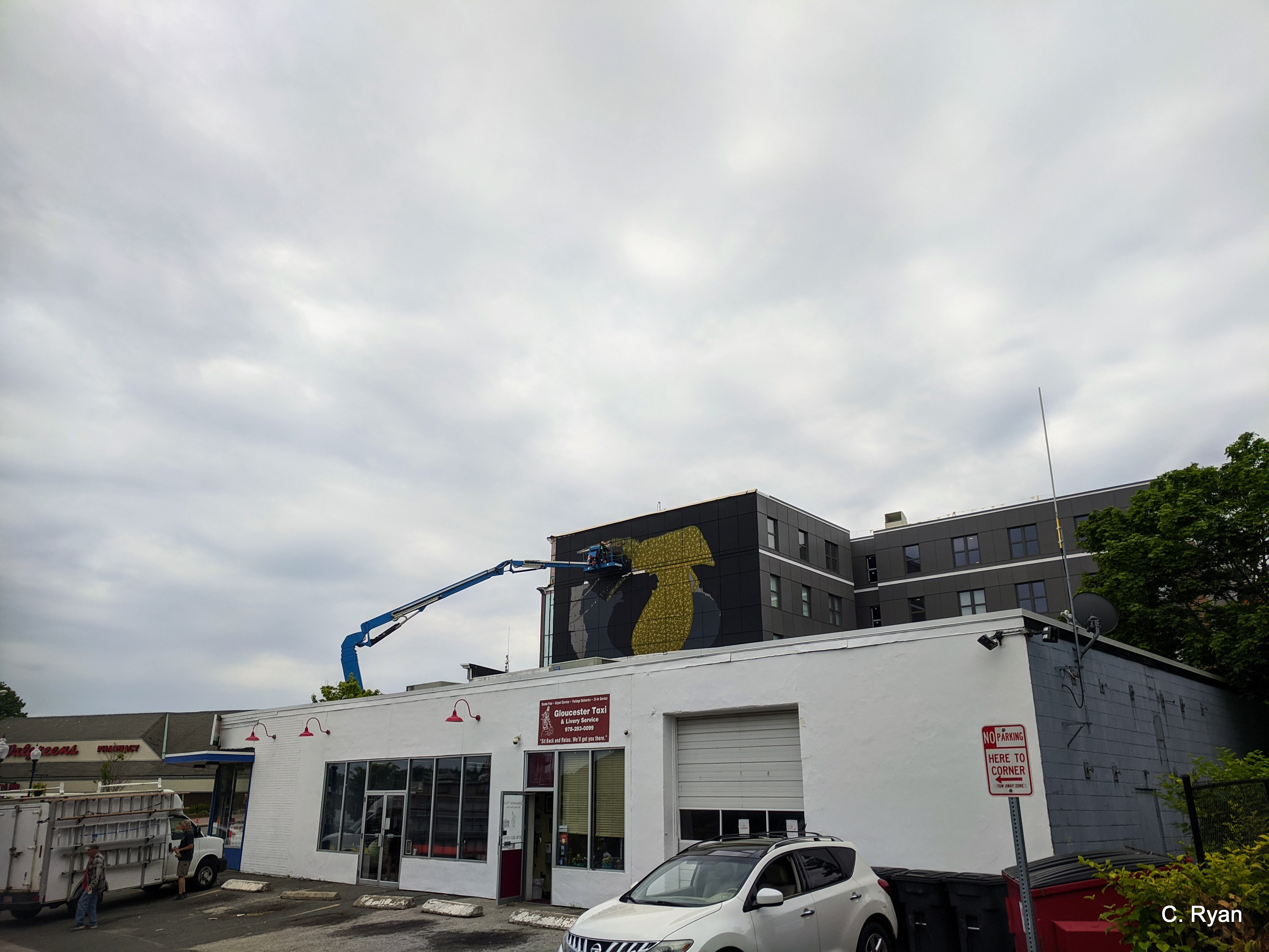 August 2021 – Splash! Enjoy photographs of Grimdrops jazzy hometown portrait off the Elm Street side of Action, Inc. **new** Harbor Village apartment building in downtown Gloucester, Massachusetts. The large scale commission heralds Gloucester’s upcoming 400th celebration in 2023. The artist was born and raised in East Gloucester.