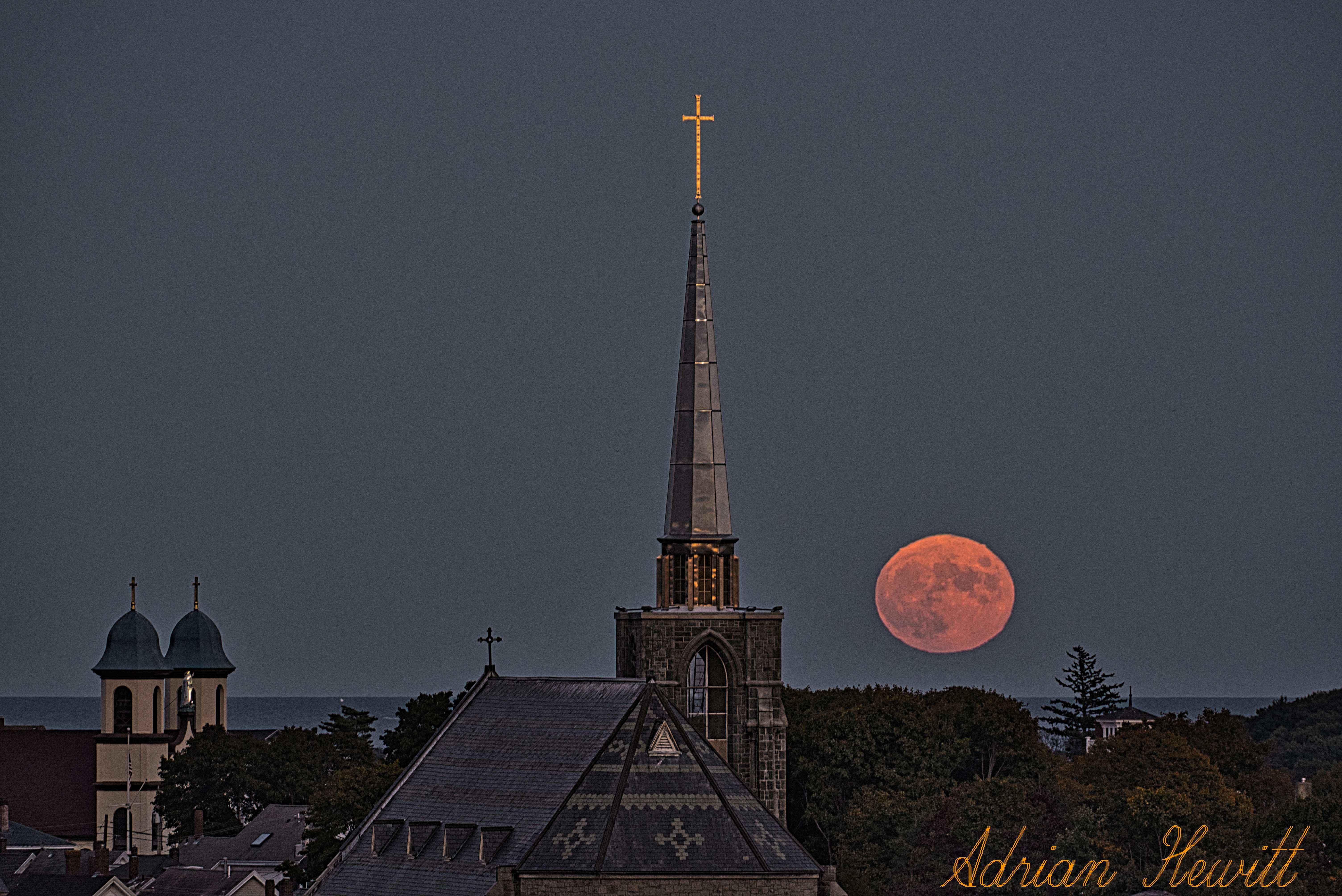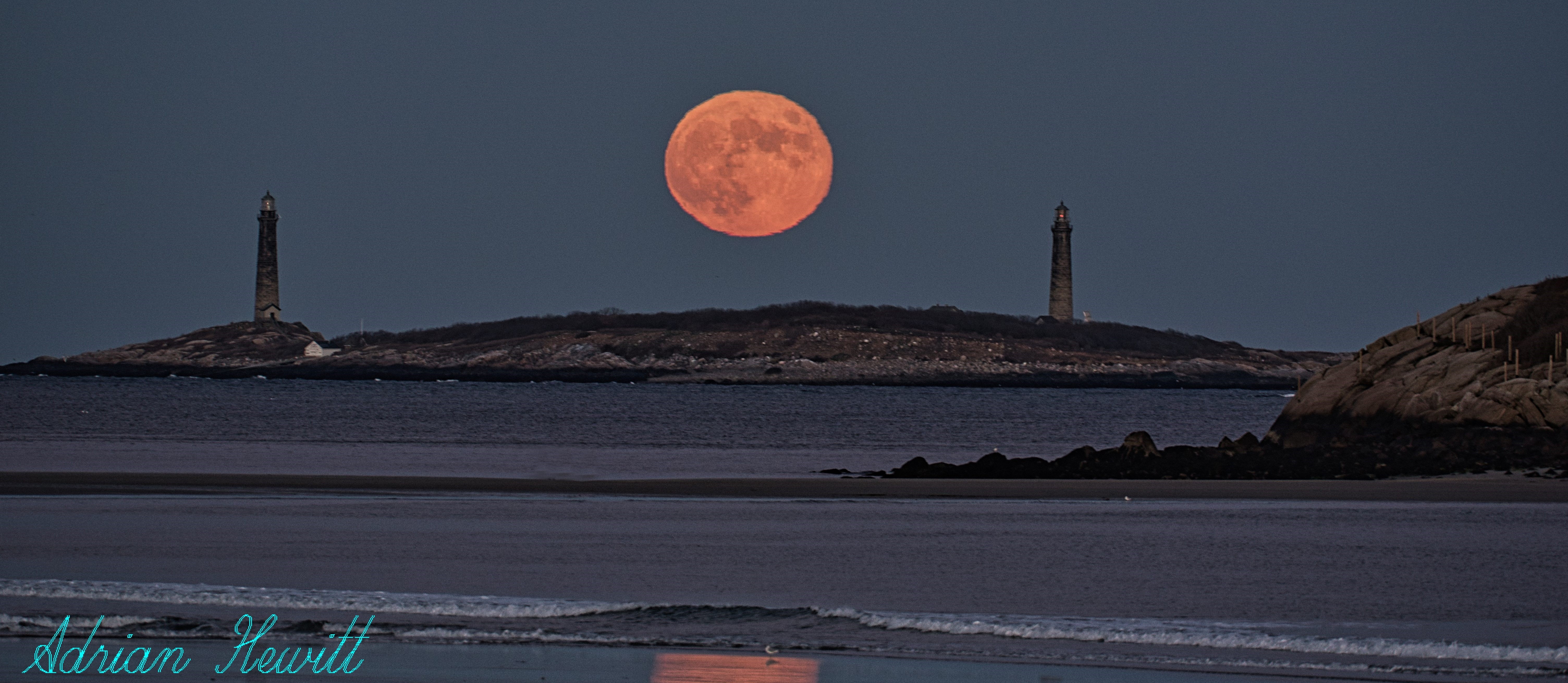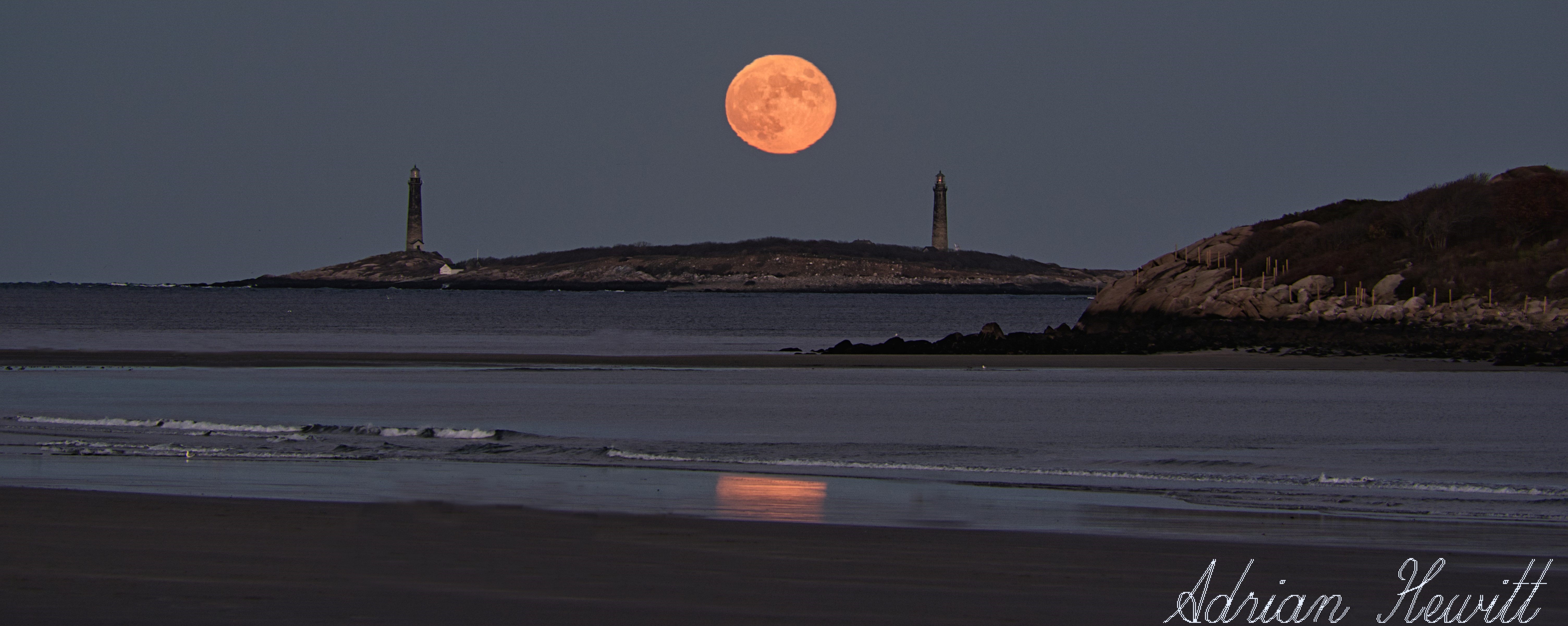 Beaver Blood Moon between the Twin Lights. Photo by Adrian Hewitt abhewitt7@gmail.com