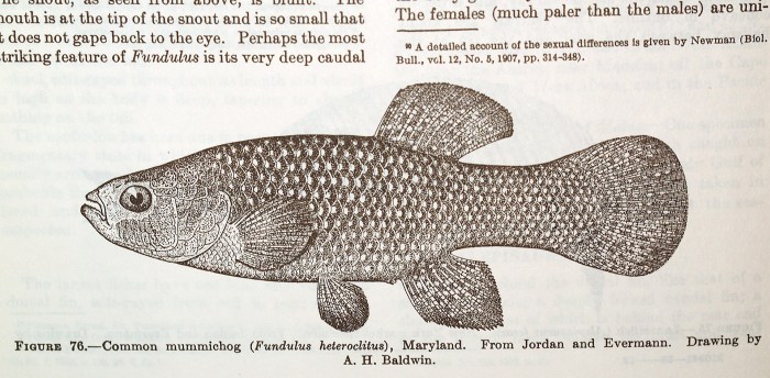Killifish; Salt-water minnow; Chub; Mummy… So closely do they hug the shore that a line drawn 100 yards from land would probably enclose all the mummichogs in the Gulf of Maine… Seldom more than 4 inches long. Abound in the tidal creeks that cut our salt marshes, in muddy pools, in ditches. Shoals of “mummies” may often be seen moving in with the flood tide. Often trapped in little pools until the next tide arrives.