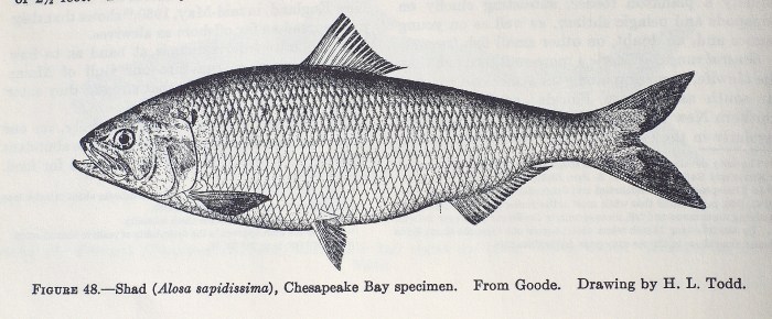 A typical member of the herring tribe. Largest of the herrings that visit our gulf, growing to a length of 2 ½ feet. One tagged in Chesapeake Bay was recaught 39 days later at Race Point. The shad, like the alewife, spends most of its life at sea, and makes most of its growth there, but runs up into fresh rivers to spawn, the spent fish soon returning to salt water, and its fry running down also.