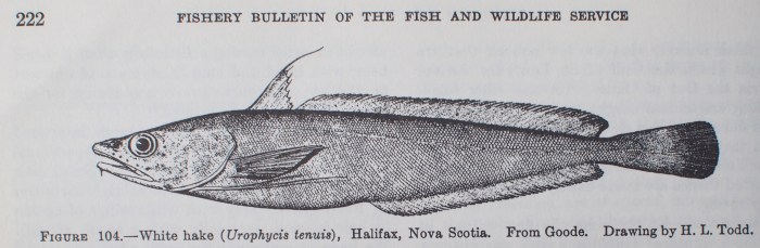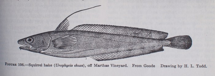 Our previous post spoke of two members of the hake tribe – WHITE HAKE aka BOSTON HAKE sometimes called BLACK HAKE and sometimes MUD HAKE when they are not simply called HAKE or their other name, LING. The other mentioned, SQUIRREL HAKE is more commonly known as RED HAKE, except when it is called LING. Got it?