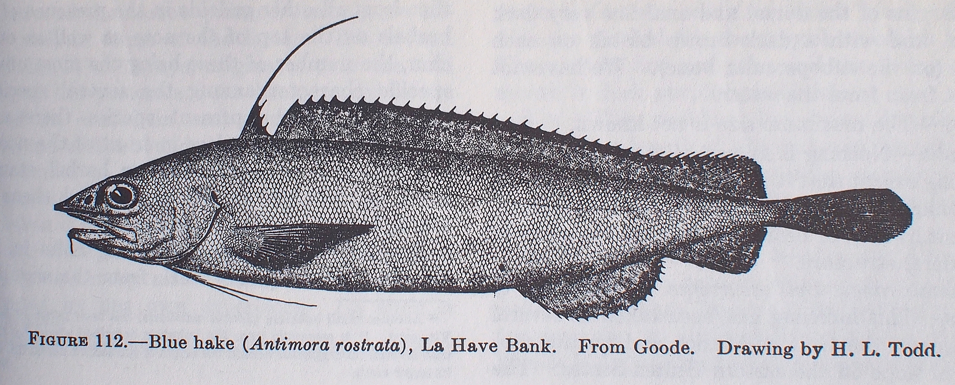 Today we have another – BLUE HAKE. It’s rare in the Gulf of Maine but common beyond the slope and has been taken at 1,000 fathoms. BLUE HAKE look much like WHITE and RED HAKE and also like BLACK HAKE which are really WHITE HAKE, as explained in the previous paragraph.