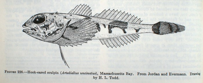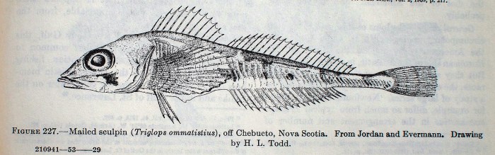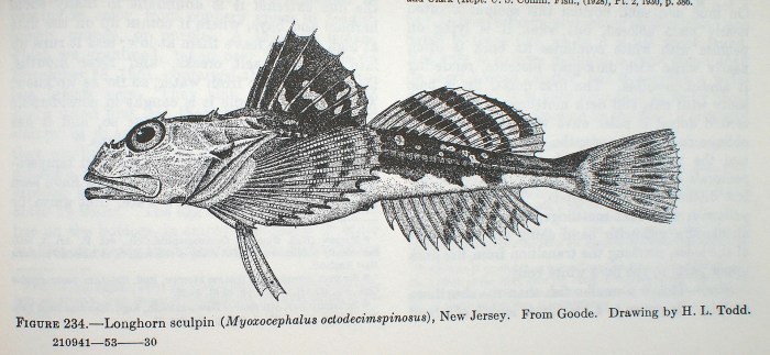 This exquisite pen and ink drawing from 1883 by H. L. Todd is just one of many by this artist in Fishes of the Gulf of Maine by Bigelow and Schroeder, 576 pp, 1953. The book is available free online courtesy of MBL/WHOI. http://www.gma.org/fogm/