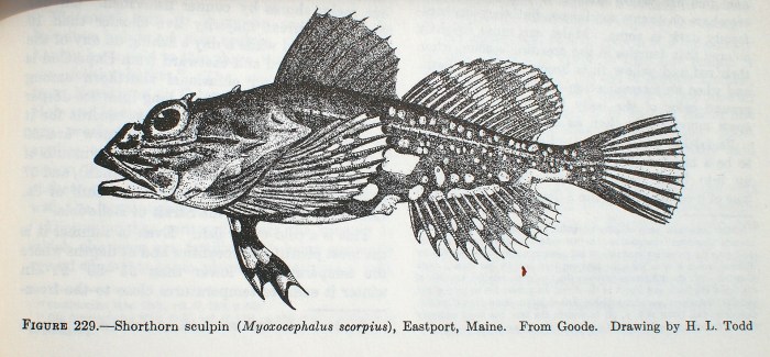 The Shorthorn Sculpin, with its large flat head, vast mouth, weak tapering body, bat-like pectorals, and insatiable appetite, typifies the sculpin race in northern seas.