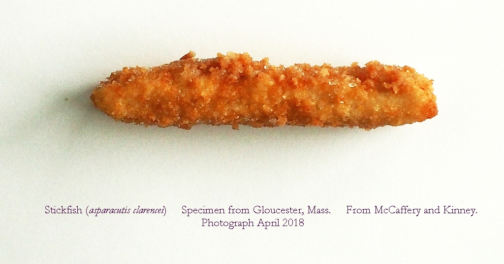 (Asperacutis clarencei) For Clarence Birdseye (1886-1956), who, right here in Gloucester, developed the process for manufacturing frozen fish blocks. Most fish sticks are cut from blocks. Mark Kurlansky’s 2012 biography of this remarkable man is highly recommended.