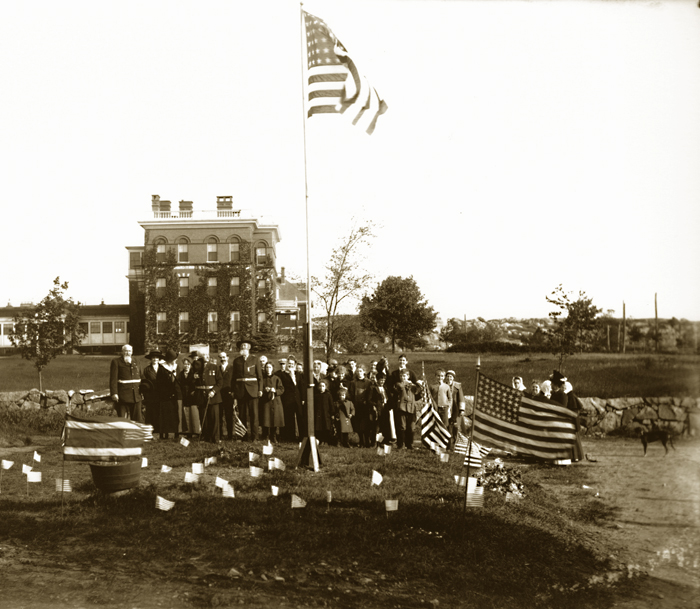 This flag raising ceremony was held at 6:30AM near Addison Gilbert Hospital. In attendance were Gloucester’s Civil War veterans of Company G, Eighth Infantry. Company G, of the Massachusetts Volunteer Militia, was organized in 1788, and was called the “Gloucester Artillery.” After being reorganized in 1852, it was named the “American Guard.” They fought in President Lincoln’s Grand Army of the Republic (GAR) from 1861 to 1865.