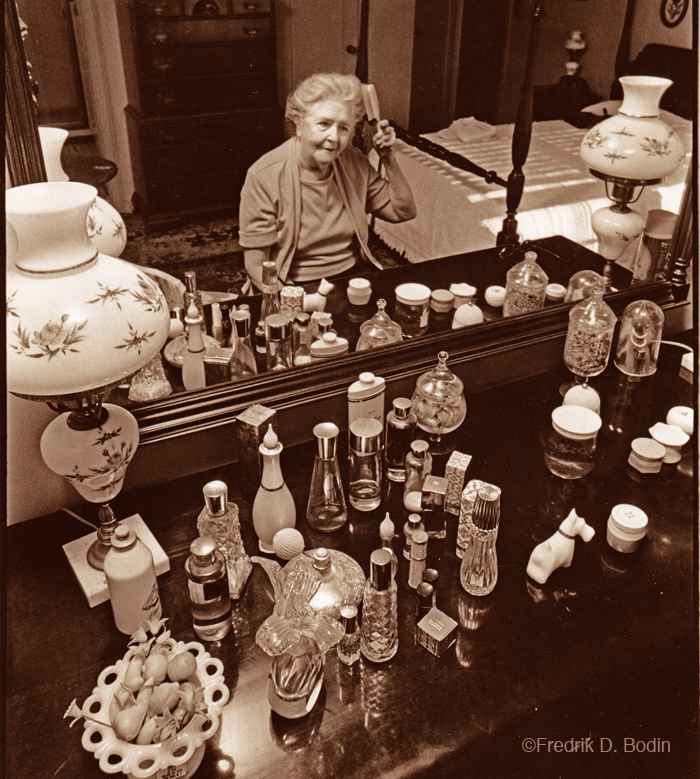 Thirty five and some years later, about 1975, I photographed my maternal grandmother, Jennie Lee (Mitchell) Scales reflected in her bedroom dresser mirror. I think the comparison of the two photos is amazing.