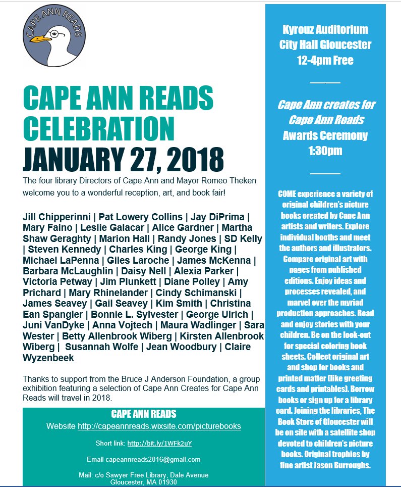 Saturday – The upcoming Cape Ann Reads celebration at Gloucester City Hall is Saturday January 27 from noon to four. Gail’s article includes interviews with the four Library Directors and Mayor Romeo Theken. The color photograph that’s reproduced is a stunning drawing by Kim Smith from one of her children’s picture books, Beauty on the Wing. There’s also a photograph from Alice Gardner’s drawing installation at The Book Store for her published book St. Peter’s Fiesta. Here’s the link to the article and a clever title design: All Booked Up: Community Reception and Fair Celebrate literature and art for Children by Gail McCarthy, Gloucester Daily Times