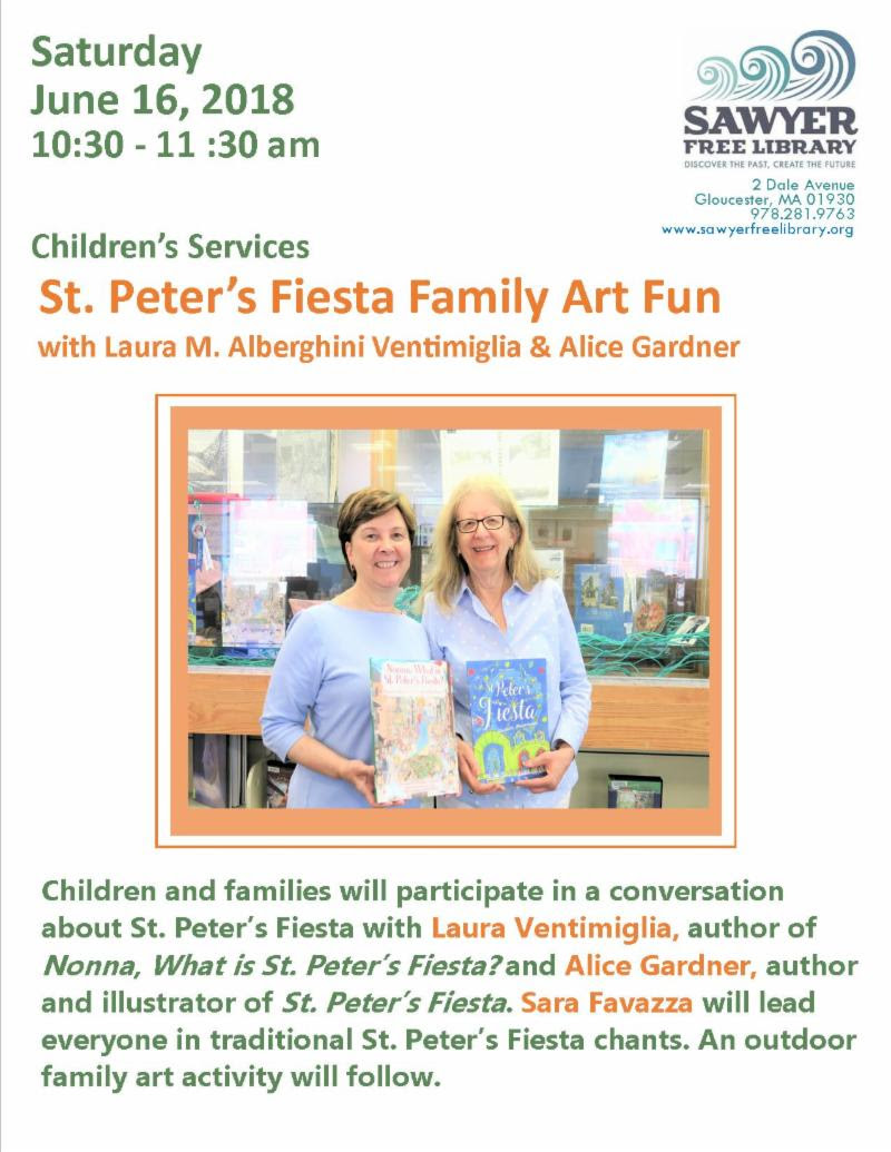 VERY SPECIAL EVENT FEATURING ST. PETER’S FIESTA CHILDREN’S BOOK AUTHORS LAURA VENTIMIGLIA AND ALICE GARDNER AT THE SAWYER FREE LIBRARY SATURDAY MORNING!