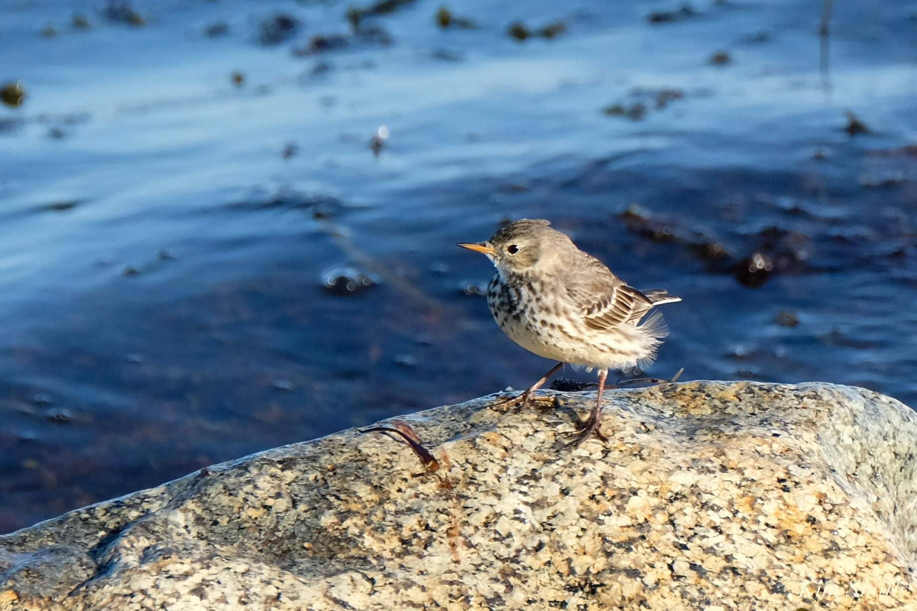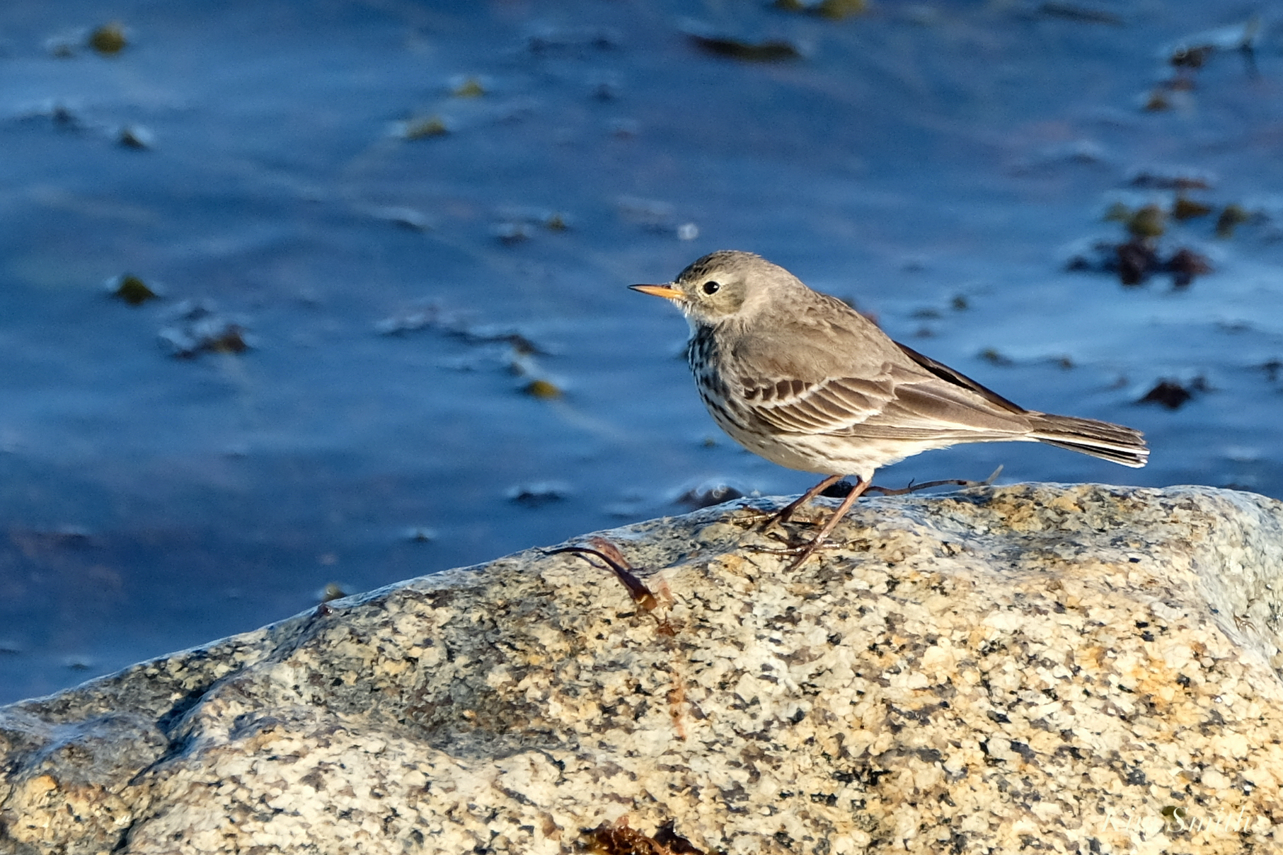 Don’t you just love the name ‘Pipit?’ At first glance the American Pipit looks rather like a Plain Jane but their sweet name complements their spunky personality. I loved watching them energetically forage on the beach as they ran hither and thither wagging their tails and craning their necks chicken-like while searching for tiny bits of seafood amongst the popples and seaweed.