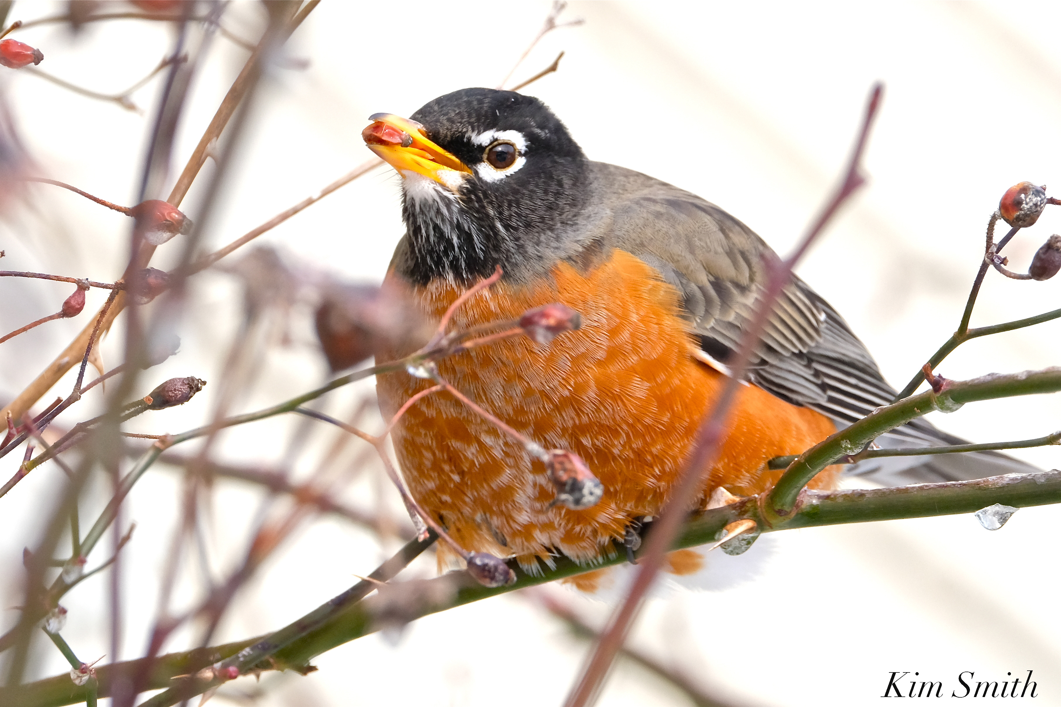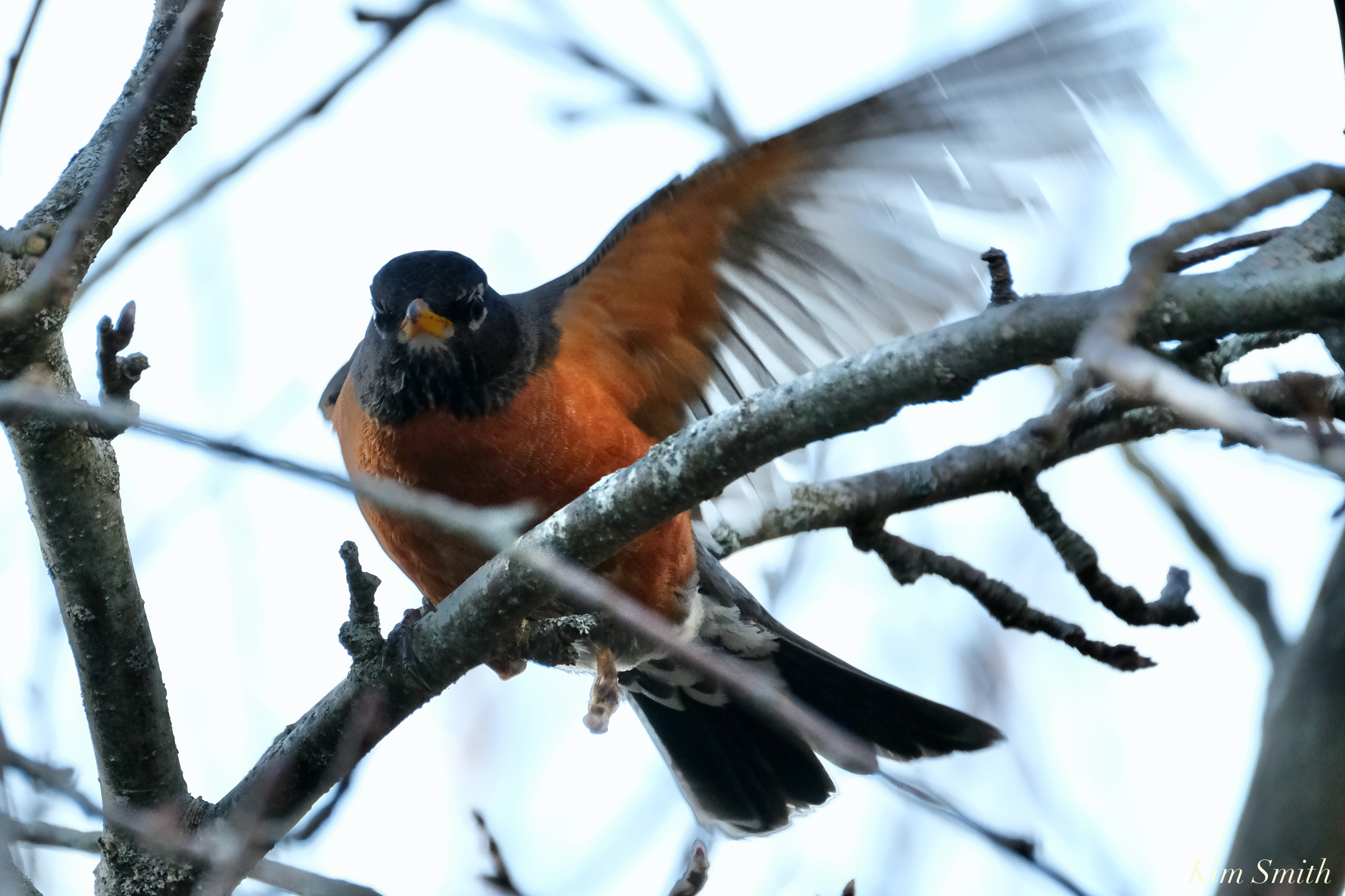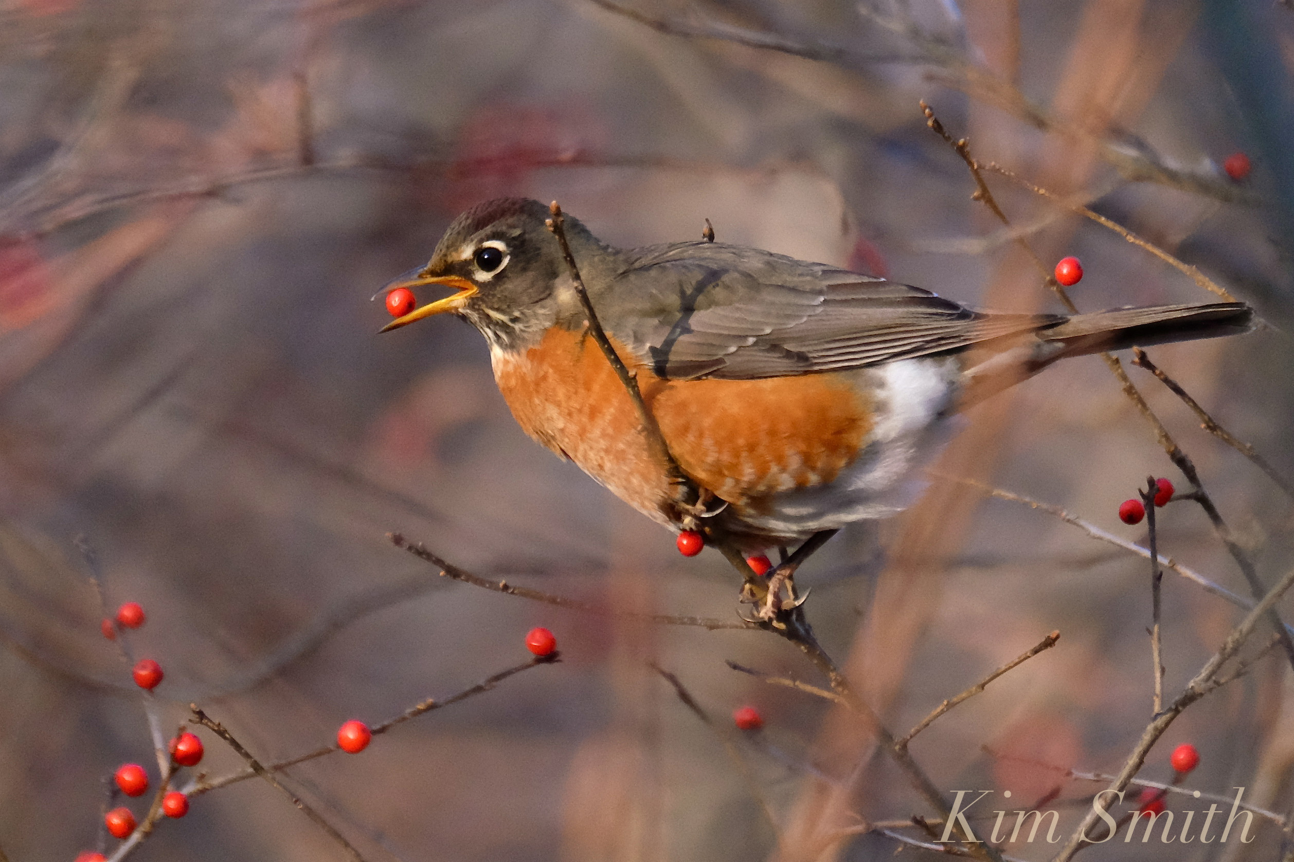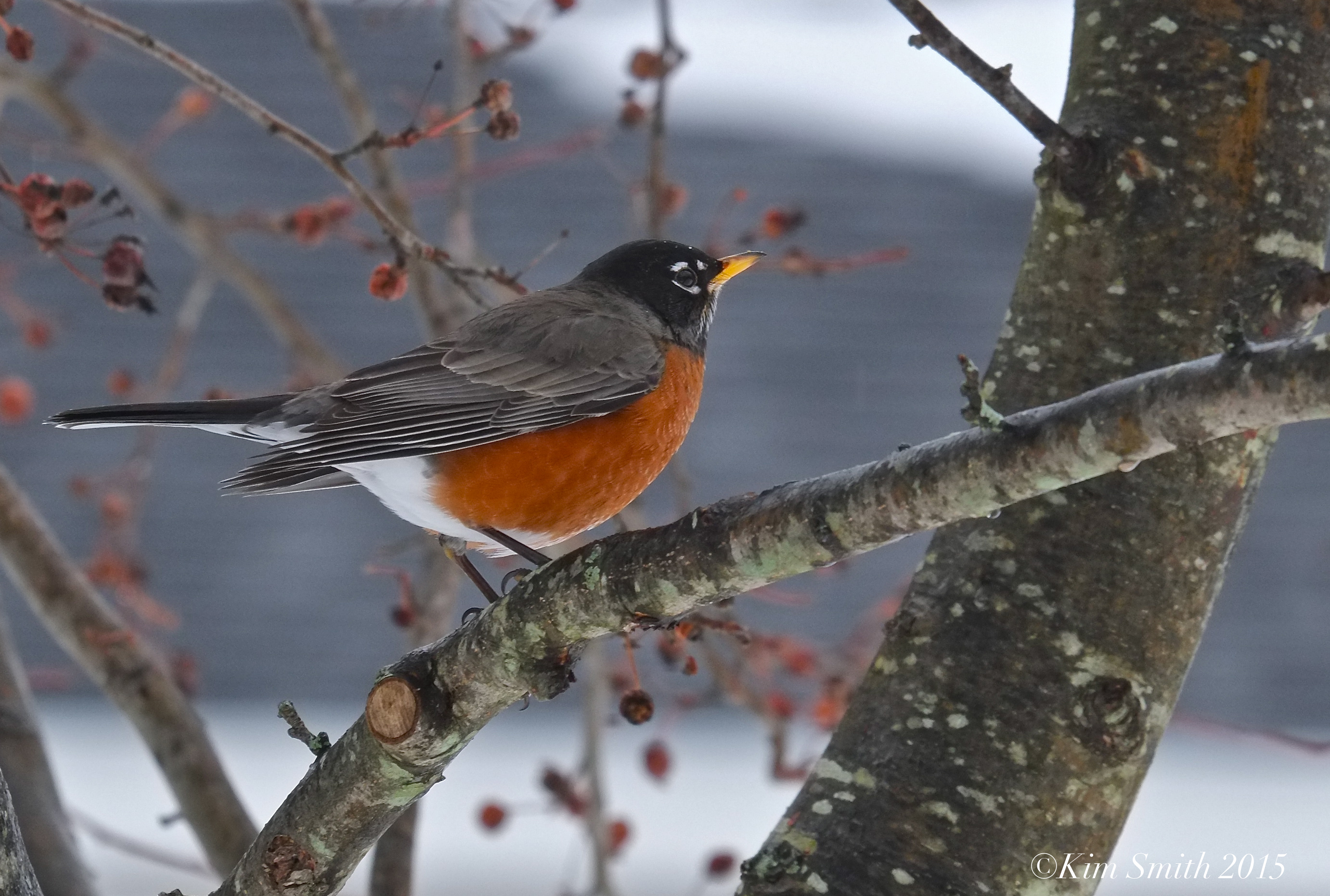 The robins in our community have several different habits for surviving winter. There are year round resident robins that breed throughout Cape Ann during warmer months and also spend the winter here. A second group only breeds in our region, then migrates further south during the winter months. A third group, the robins that we see flocking to our shores beginning round about January 28th, are migrating from parts further north. They are very hungry and are looking for berries, fruit, and small fish.