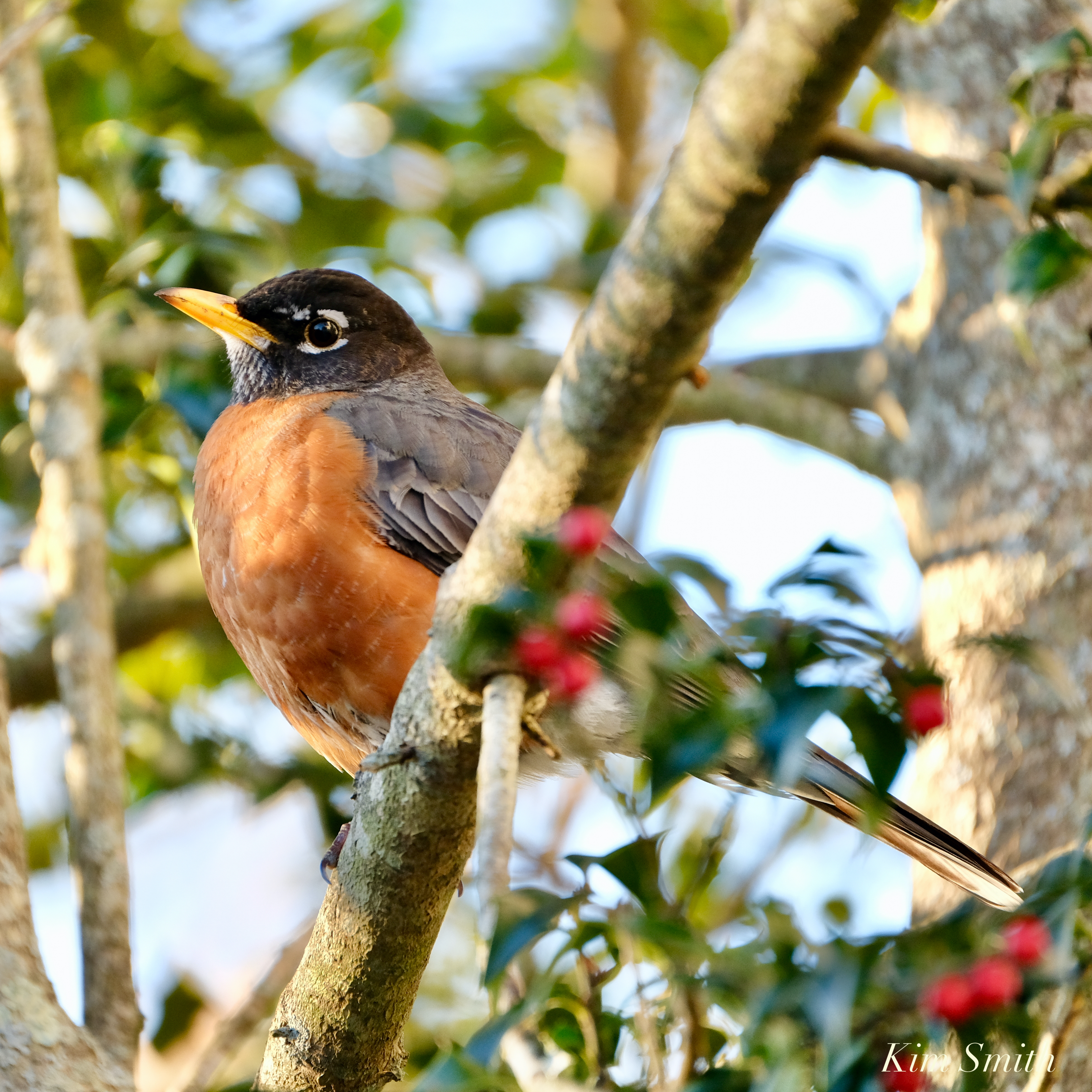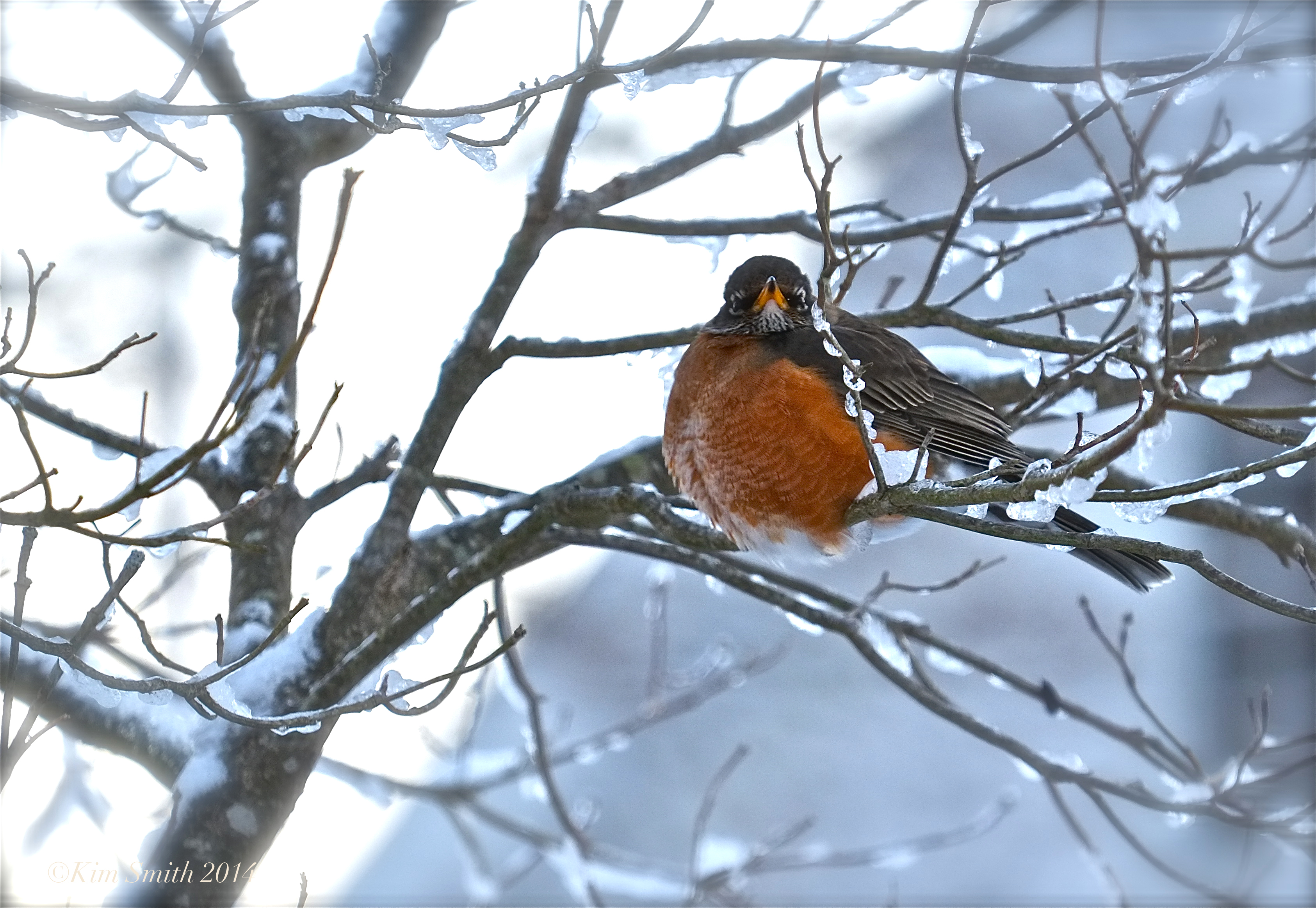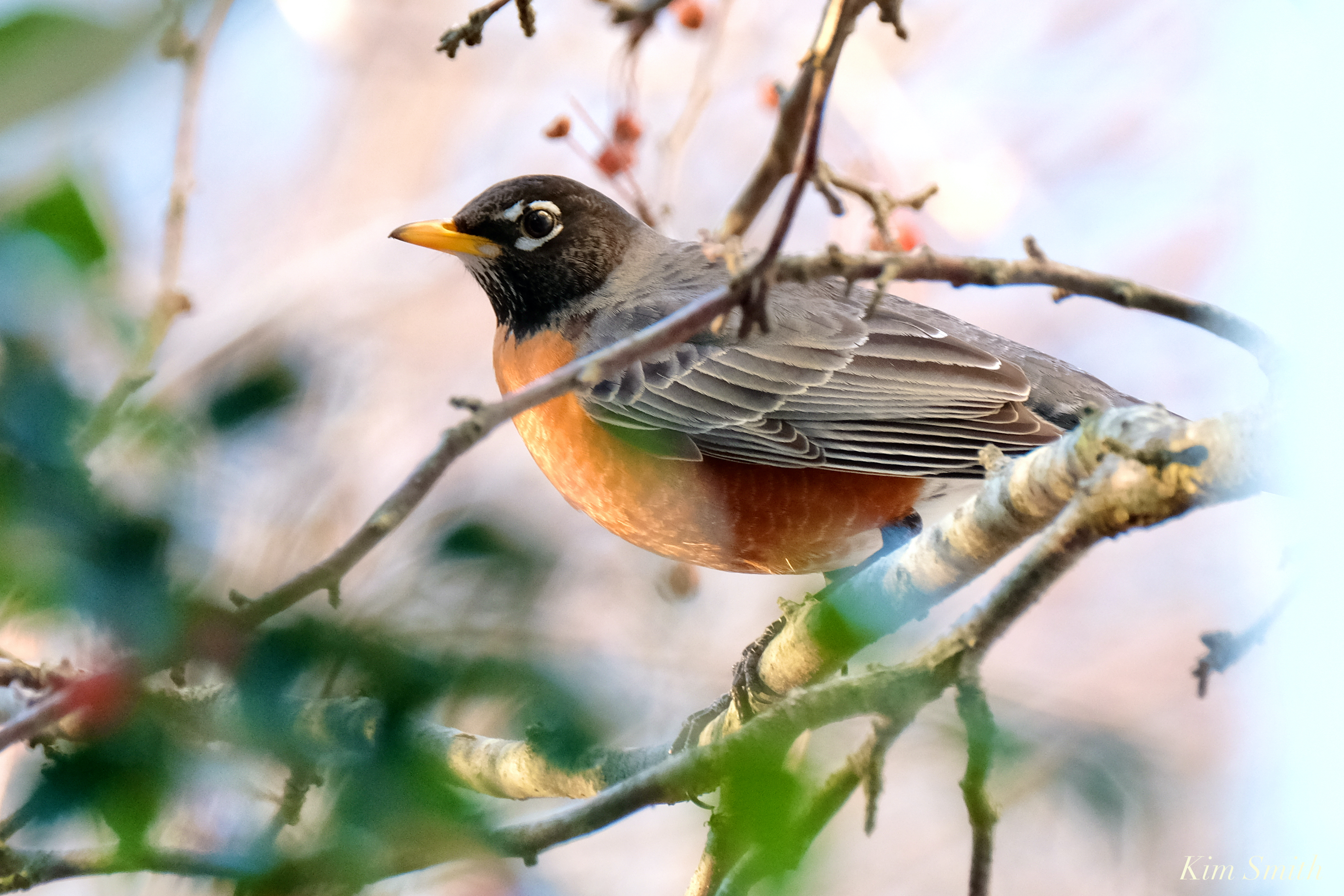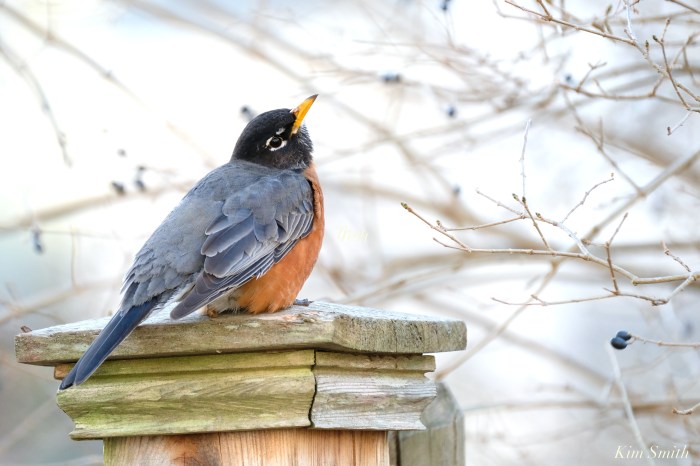 The robins in our community have several different habits for surviving winter. There are year round resident robins that breed throughout Cape Ann during warmer months and also spend the winter here. A second group only breeds in our region, then migrates further south during the winter months. A third group, the robins that we see flocking to our shores beginning round about January 28th, are migrating from parts further north. They are very hungry and are looking for berries, fruit, and small fish.