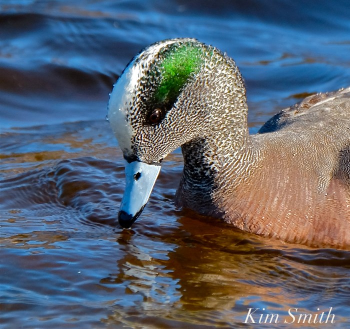 For the past week or so, a duo of male American Wigeons has been spotted foraging along the coastline. They dip and dabble, close to the shore, and are eating sea lettuce and seaweed.