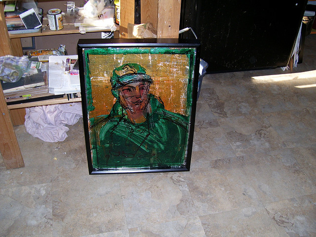 I repaired the box. The glass is plexi, it is pitted, scratched with mildew stains. the box lining is warped. the posters continue to shrink. the bottom was coming apart, i screwed it back together. wiped off a crust of pollen and grime. gave it a wash of slow set gilder’s oil. gave it a speed dry with the hot sun. laid down aluminum leaf. burnished the leaf to an almost hard tack (t?); rubbed in non oxidizing gold dust, light sipe with a milky tacky brush. laid down more aluminum leaf. inscribed sharpie drawing. i saw the silhouette of gloucester in the leaf, then signed it. one more burnish. done. the only audience? a man taking a deep lumbering nap on the rise behind me.