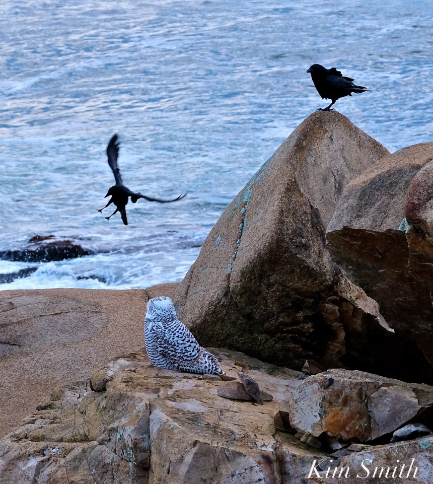 Crows and owls are natural enemies because a murder of crows may mob an owl to death (or any raptor by which it feels threatened) and owls occasionally eat crows. Crows are diurnal, which means they feed during the day. The majority of North American owl species that they encounter are nocturnal (night feeding). In the case of Snowy Owls, which feed both day and night, their paths may occasionally cross, as happened when Hedwig moved into the crow’s territory along Gloucester’s Atlantic Road.