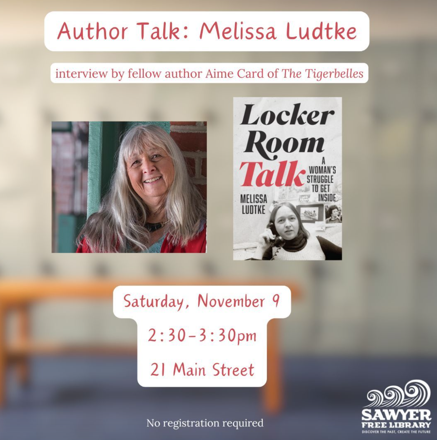 Please join the Sawyer Free Library on Saturday, November 9 at 2:30 pm for an author talk with Melissa Ludtke, who will be discussing her book, Locker Room Talk: A Woman’s Struggle to Get Inside, her gripping account of being at the core of this globally covered case that churned up ugly prejudices about the place of women in sports. Joining her in the conversation will be fellow local author of The Tigerbelles, Aime Card.