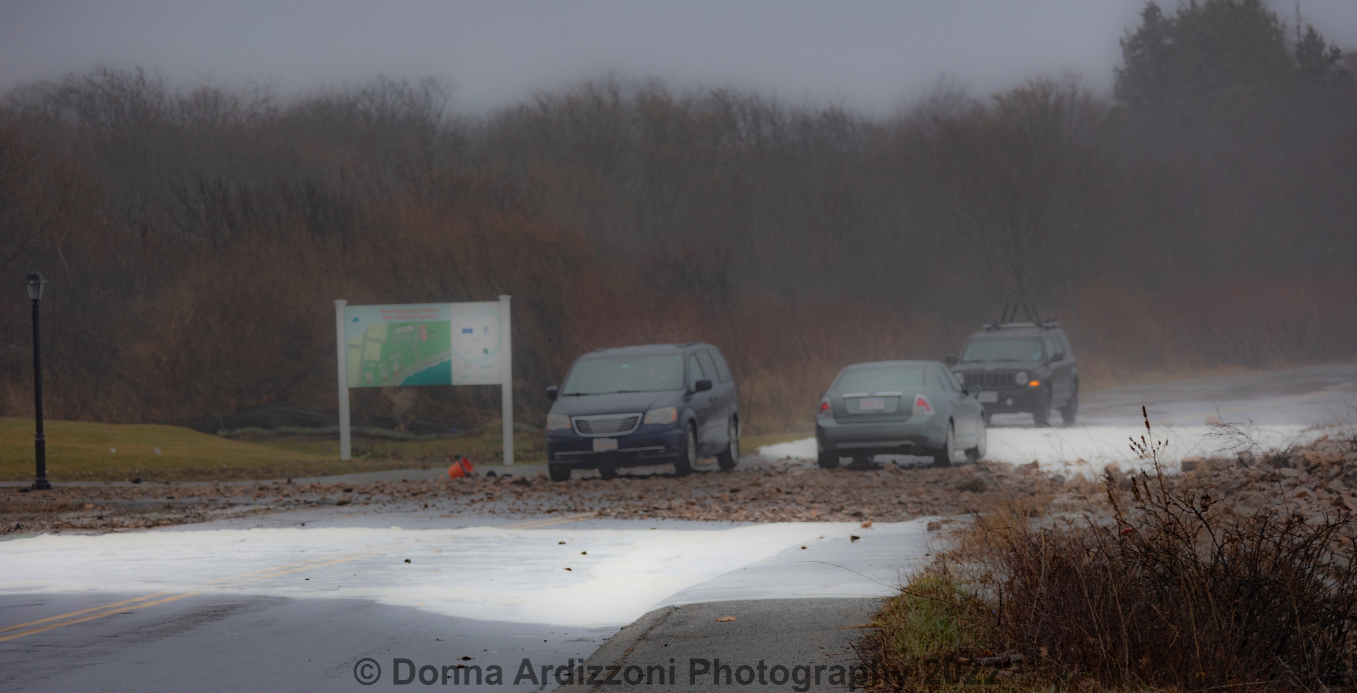 Jingle Bell Storm rise sunrise photos Dec. 23, 2022, about 3 hours before the next high tide: Power is on at Long Beach; Creek level at Good Harbor Beach footbridge; Salty Salt Island; Twin Lights, Thacher Island – sunrise spray and waves; Back Shore