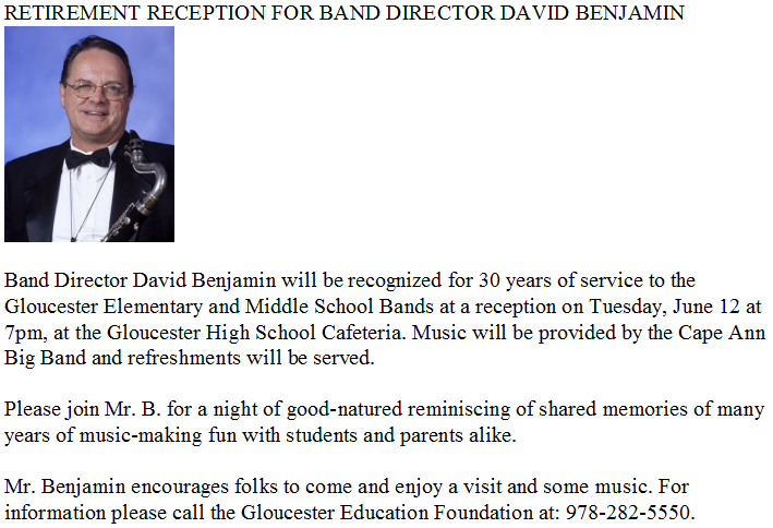 I’m hoping you can help me to get the word out on Good Morning Gloucester about a retirement party we are having for my husband, David Benjamin. He is the O’Maley School and Gloucester Elementary School Band Director. He is retiring after thirty years with the Gloucester Public Schools and we would like to let his former students and their families know that there is going to be a send-off reception on Tuesday, June 12, from 7-9pm at the Gloucester High School cafeteria. The Cape Ann Big Band will perform and refreshments will be served. I have attached the invitation I sent to some of his friends and colleagues. I can be reached by email (this address) or home telephone: 978-281-2286.