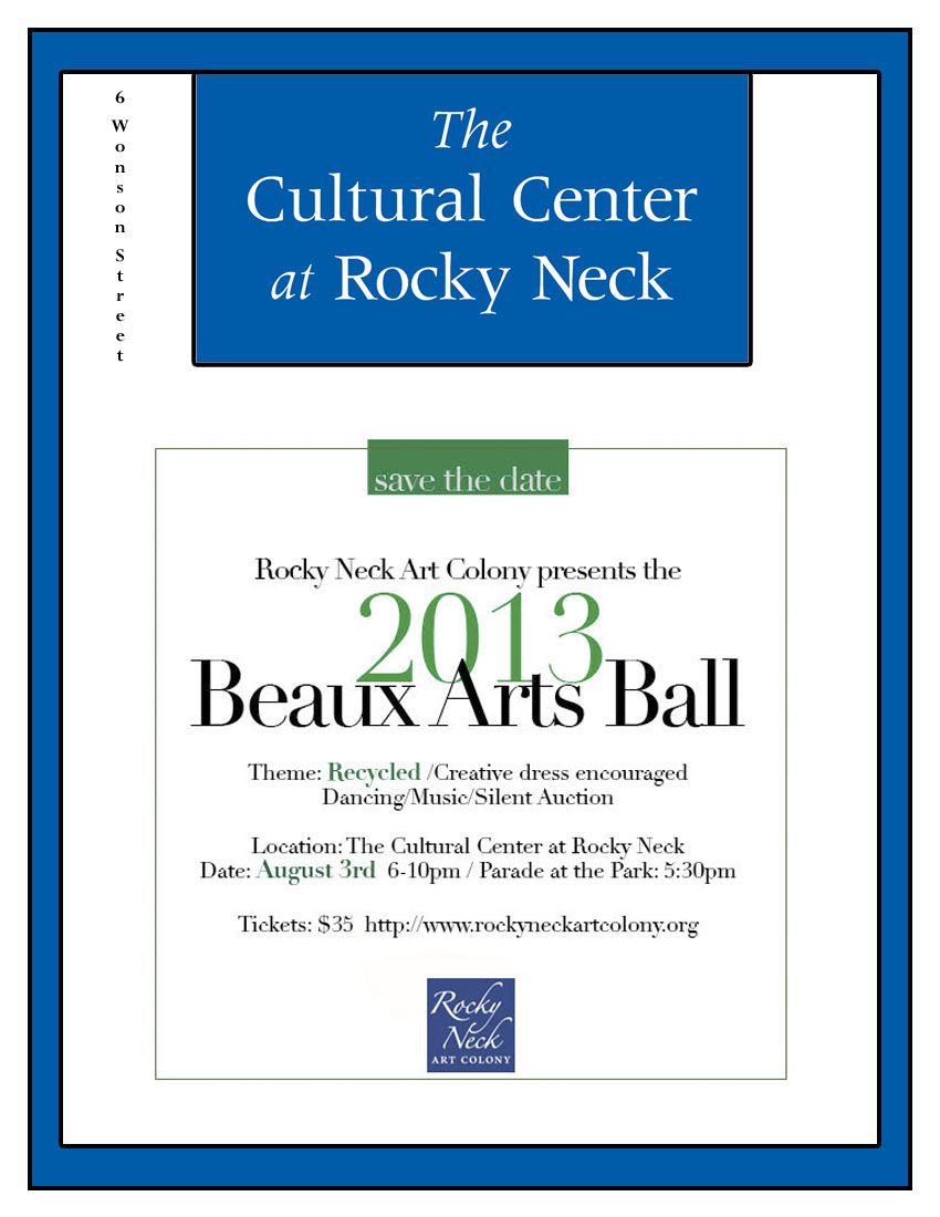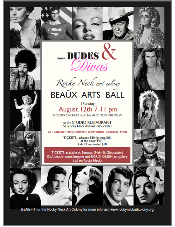 Friday, Sept 12: ****ANNUAL BEAUX ARTS BALL**** at the Studio Restaurant, 7:30, costume parade from the Center at 6:30 (you do not have to wear a costume, but it is fun if you do). Ball Tickets $35 for RNAC members/$50 for non members/$100 gets you a RNAC membership and a free ticket, and Wicked Tuna Raffle tickets can be purchased online at http://www.rockyneckartcolony.org/events.php